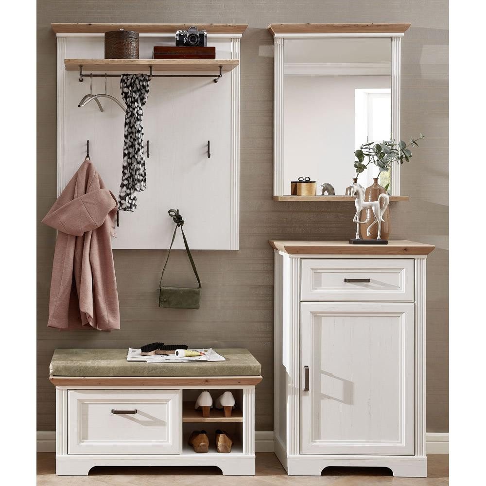 Ist die Haustür aufgeschlossen, überzeugt die Landhausgarderobe im modernen Stil. Das Programm JÜLICH-36 können Sie in zwei Farbvarianten erhalten, jeweils mit Soft-Close und Selbsteinzug, ebenfalls ist das Sitzkissen enthalten. Auch die Griffe, sowie die Haken und die Metallreling sind inklusive.