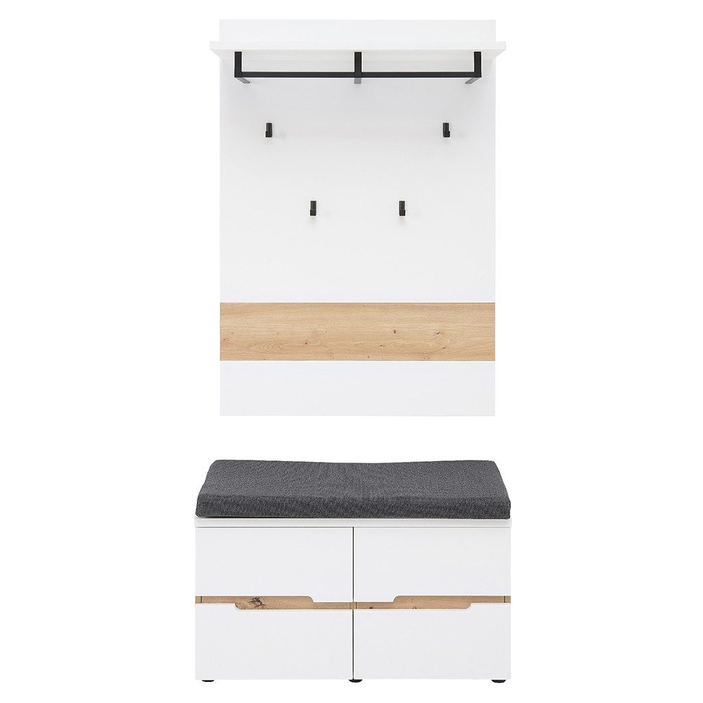 Die matt-weißen Fronten und die Akzente in Artisan Eiche wirken modern und wohnlich zugleich. Das Garderobenpaneel bietet Platz für Jacken und Accessoires, während die gepolsterte Sitzbank mit Stauraum den Alltag erleichtert.