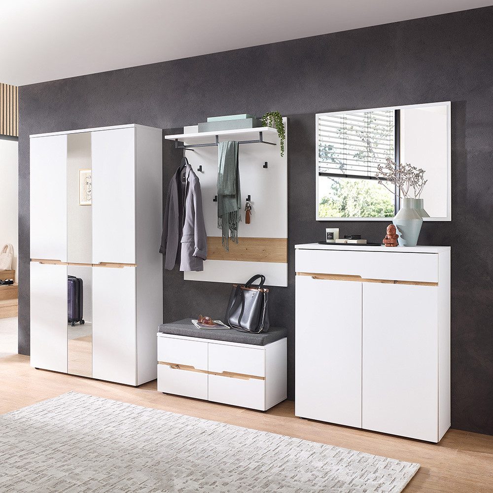Dieses großzügige 5-teilige Garderoben-Set schafft ein harmonisches Gesamtbild in deinem Eingangsbereich und bietet gleichzeitig jede Menge Platz für Kleidung, Schuhe und Alltagsgegenstände.