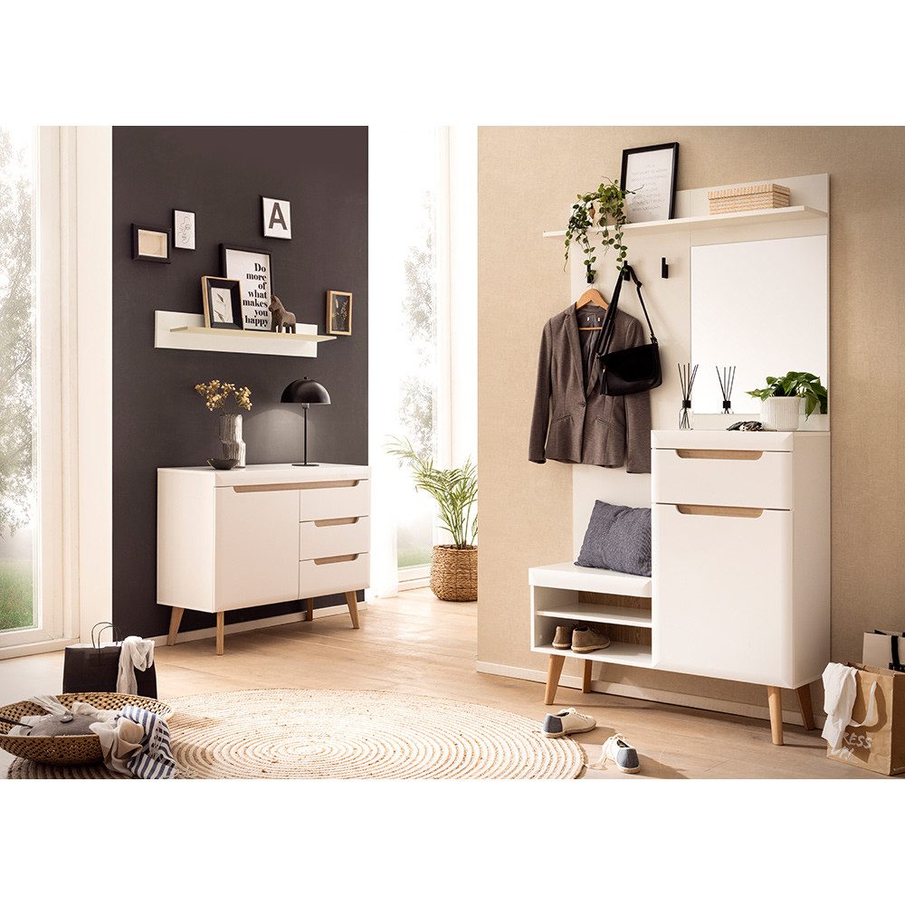 Die Garderobe bietet einen Spiegel, eine Schublade, eine Tür und offene Schuhfächer. Das Sideboard sorgen für zusätzlichen Stauraum. Dezente Griffmulden und skandinavisches Design machen das Set zu einem echten Hingucker.
