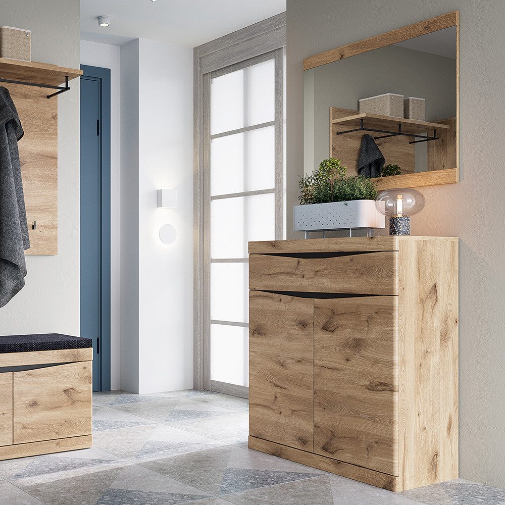 Diese Garderobenmöbel bestechen durch ihr zeitloses, modernes Design und ihre herausragende Funktionalität. Die warmen Eiche Töne schaffen ein besonderes Ambiente in deinem Flur, während die anthrazitfarbenen Abdeckplatten hinter den Griffmulden dezente Akzente setzen und das hochwertige Erscheinungsbild der Serie unterstreichen. Perfekt aufeinander abgestimmt, umfasst die Serie alles von einer Kommode bis hin zu einem Spiegel – so lässt sich jeder Flur individuell und stilvoll gestalten.