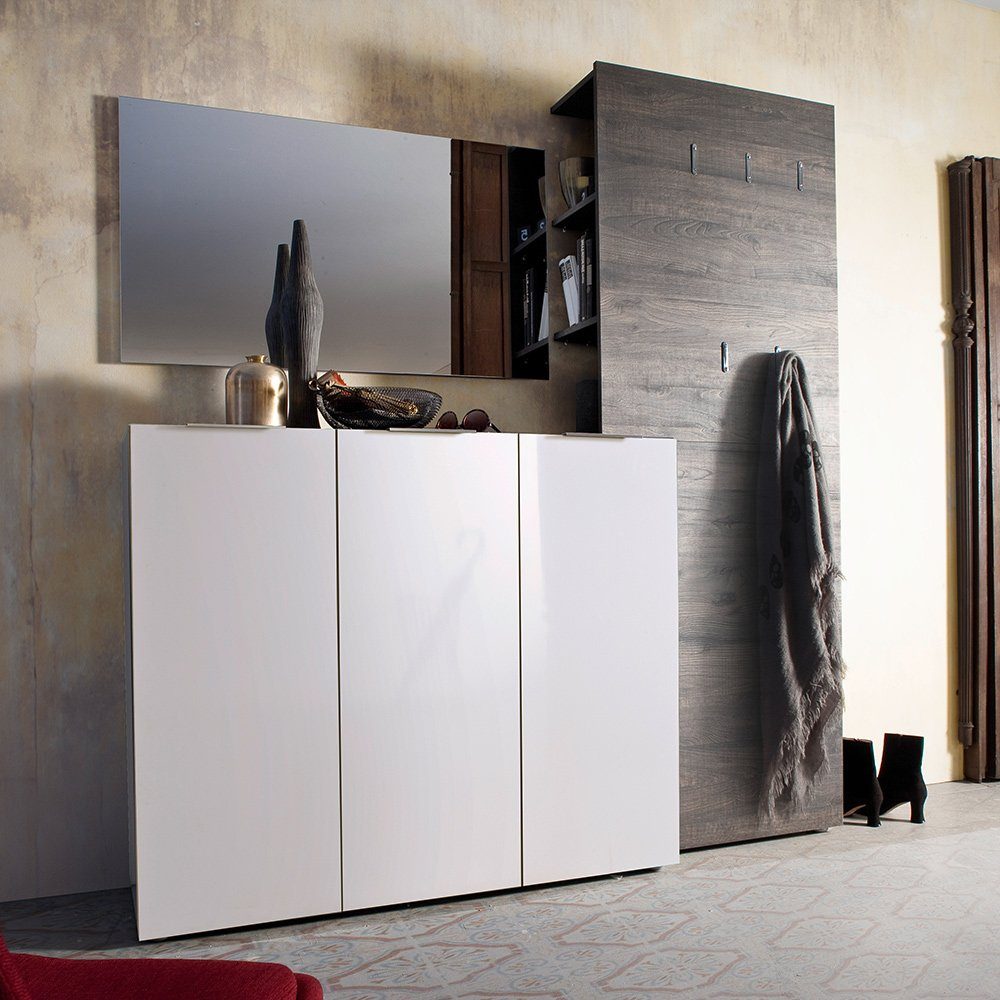 Kombiniere Garderobenpaneele in Eiche oder Wenge, ausgestattet mit 5 Kleiderhaken und einer versteckten Kleiderstange, mit Kommoden in weiß Hochglanz oder anthrazit und einem passenden Spiegel. Du hast viele Schuhe? Kein Problem, denn die Kommoden bieten dir Platz für 20 oder sogar 30 Paar Schuhe!
