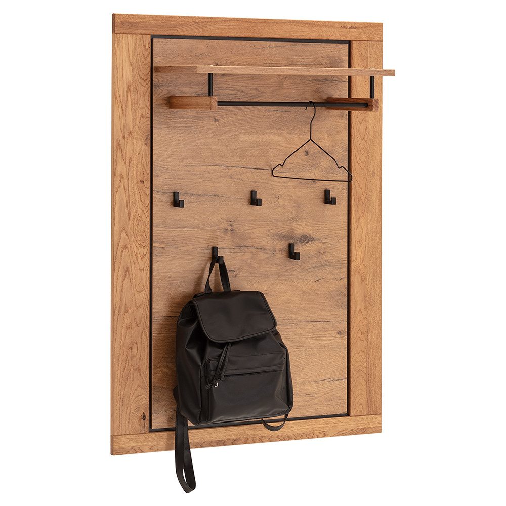 Fronten aus massiver Wildeiche geölt strahlen Behaglichkeit aus, der Korpus in passender Nachbildung ist robust und pflegeleicht. Eine Hutablage, eine Kleiderstange und fünf Haken bieten Platz für Jacken, Taschen und Accessoires. Schwarze Details setzen markante Kontraste.