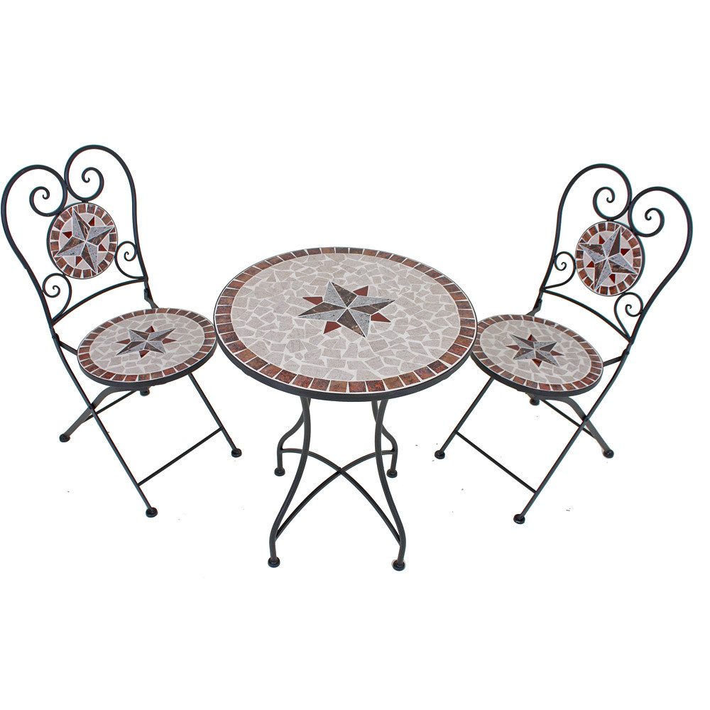 Da Balkonset der Serie GARDA-120 bestehend aus zwei Stühlen und einem Tisch in klassisch mediterranem Stil mit dekorativem Mosaik aus keramischem Steingut in der Tischplatte, den Sitzflächen und der Rückenlehne. Die kunstvoll sternförmig eingearbeiteten Steingutscheiben in hellgrauen, sandbeigen und steinroten Farben sorgen im Kontrast zu den geschwungenen Bögen des schwarz lackierten Stahlgestells für einen äußerst dekorativen Blickpunkt im heimischen Grün.