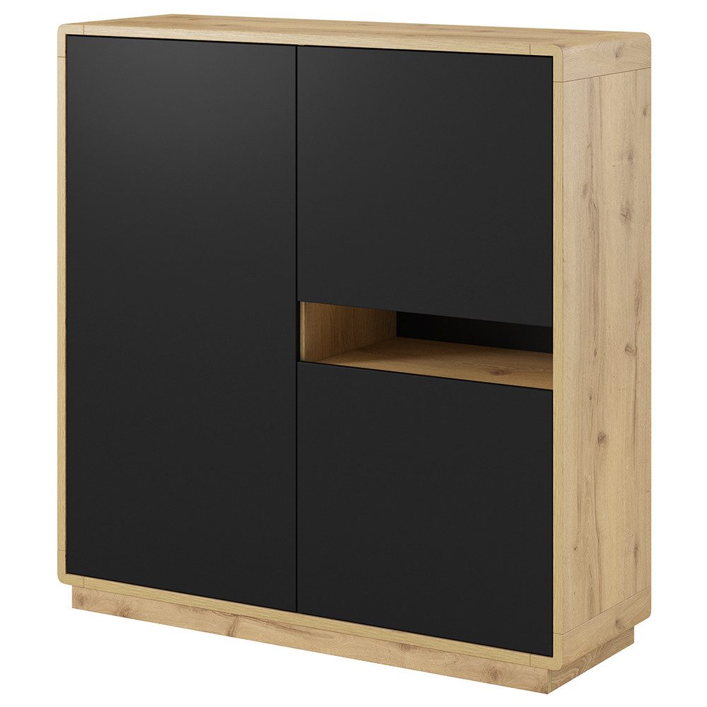 In diesem Highboard lassen sich viele nützliche Dinge verstauen. Weingläser für gemütliche Abende und die passenden Gesellschaftsspiele, sowie der Süßigkeiten-Vorrat oder auch Fotoalben und Bücher finden hier ihren Platz. Durch das offene Fach wird die Optik aufgelockert und das Möbelstück kann mit saisonaler Dekoration immer wieder neu gestaltet werden.