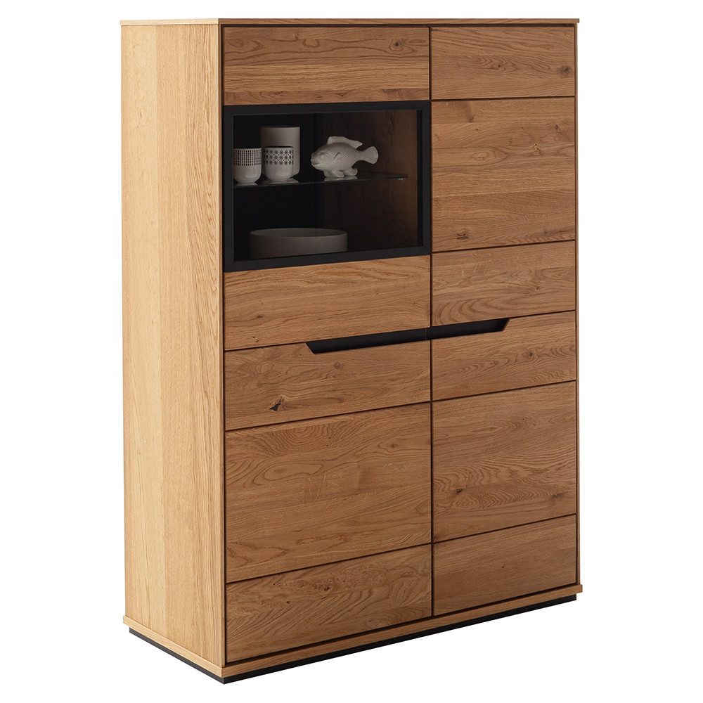 Die warme, geölte Eiche bringt Ruhe in deinen Alltag, während der schwarze Metallrahmen im Glasfach elegante Kontraste setzt. Hier treffen Lieblingsstücke auf stilvolle Bühne – und Alltag auf echten Charakter. Ob im Esszimmer oder Wohnbereich: Dieses Möbel spricht eine klare Sprache und wird zum Herzstück deines Zuhauses.