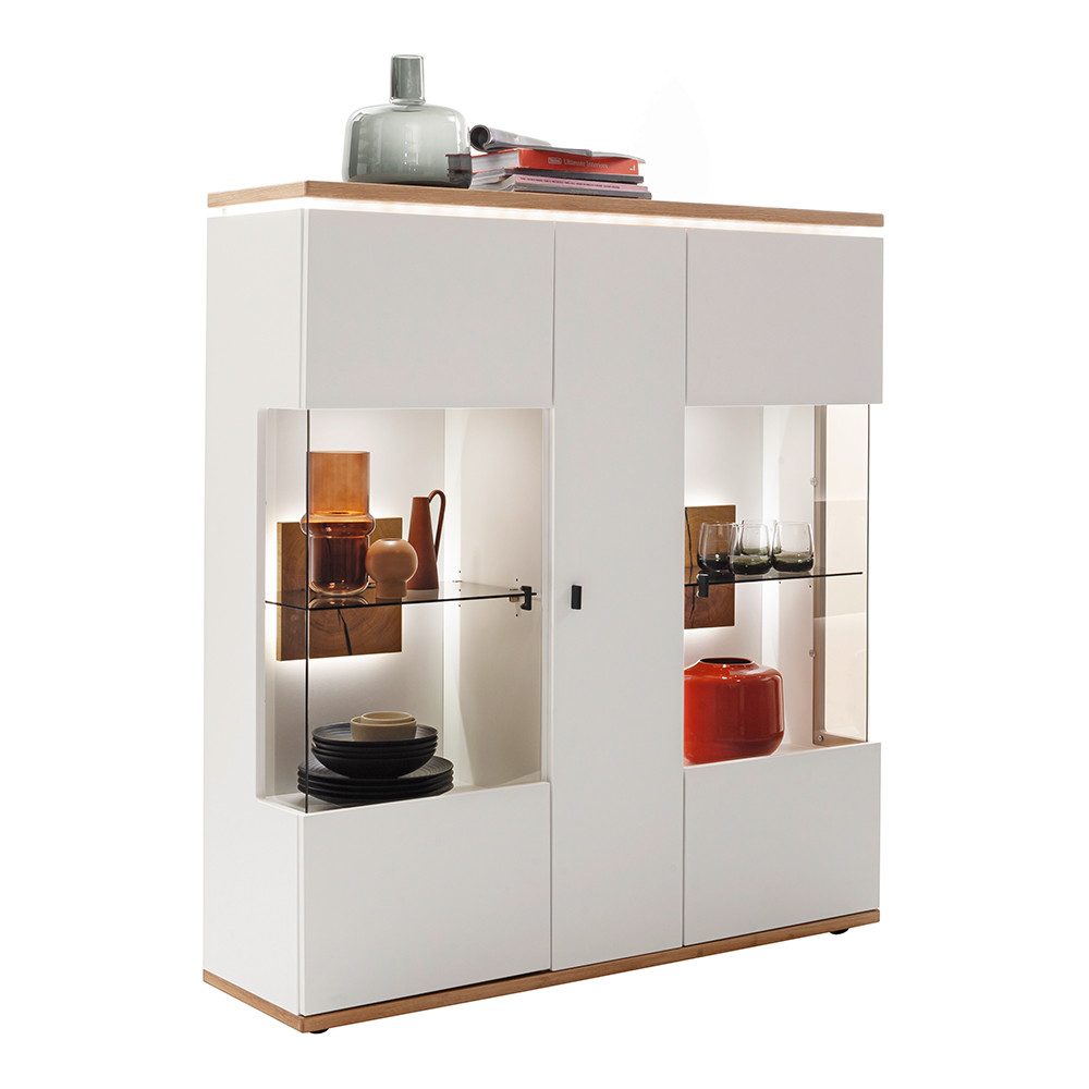 Die Serie kombiniert strahlendes weiß mit Eiche Nachbildung und veredelt jedes Möbelstück mit Hirnholz-Applikationen aus massiver Wildeiche, die sorgfältig geölt wurden.