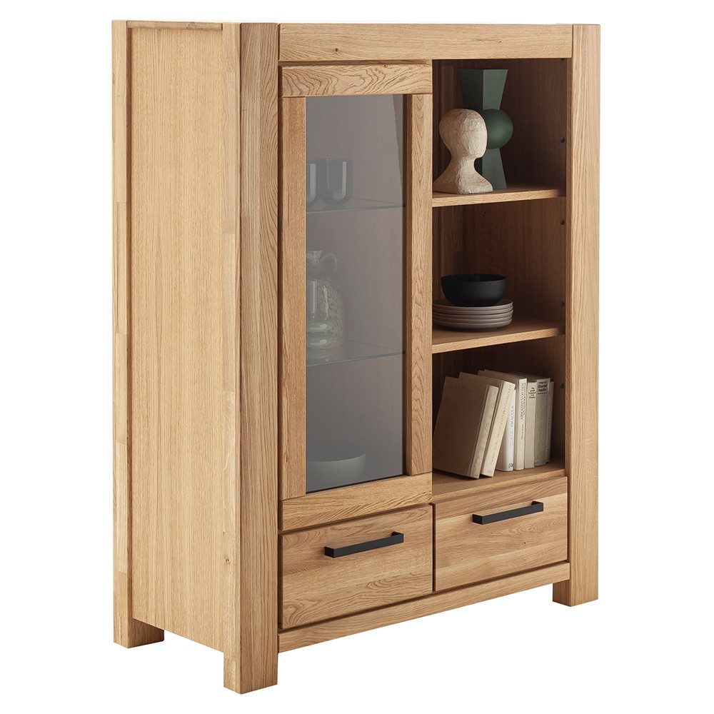 Die Wohn- und Esszimmermöbel-Serie aus Wildeiche geölt kombiniert natürliche Eleganz mit moderner Funktionalität. Schwarze Metallgriffe und Softclose-Türen sowie Schubladen sorgen für Komfort und Stil.