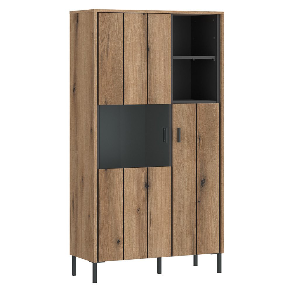 Dieses Highboard verbindet Natürlichkeit mit modernem Design: Das warme Eiche-Dekor trifft auf anthrazitfarbene Akzente, schlanke Metallfüße und dezente Griffe – eine stilvolle Kombination für ein harmonisches Zuhause. Mit zwei Türen – eine davon mit edlem Glaseinsatz – sowie zwei offenen Fächern und fünf Einlegeböden bietet dir das Möbelstück sowohl geschlossenen Stauraum als auch Platz für Deko, Gläser oder Lieblingsstücke. Die Türen sind mit Softclose ausgestattet und schließen angenehm leise. Ob Industrial, Boho oder modern – dieses Highboard passt zu vielen Wohnstilen und bringt eleganten Stauraum in dein Wohnzimmer, Essbereich oder Büro.