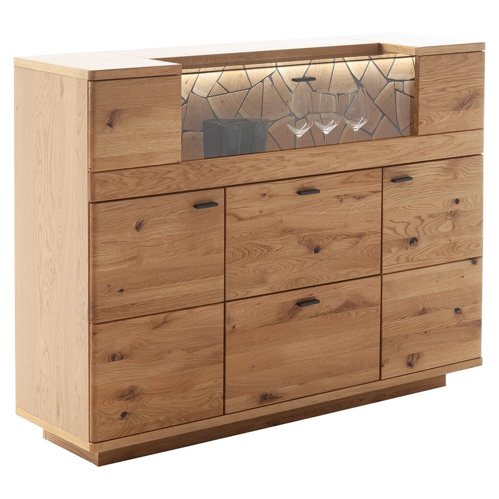 Geölte Fronten aus massiver Eiche strahlen Wärme aus, während die LED-Beleuchtung die Glaselemente und die Rückwand in Scheitholzoptik perfekt hervorhebt. Softclose bei Türen, Schubladen und Klappe sorgt für Komfort im Alltag. Mit großzügigem Stauraum und leuchtenden Details wird dieses Highboard zum Highlight in deinem Zuhause – hol es dir jetzt und genieße wohnliche Atmosphäre mit besonderem Charakter!