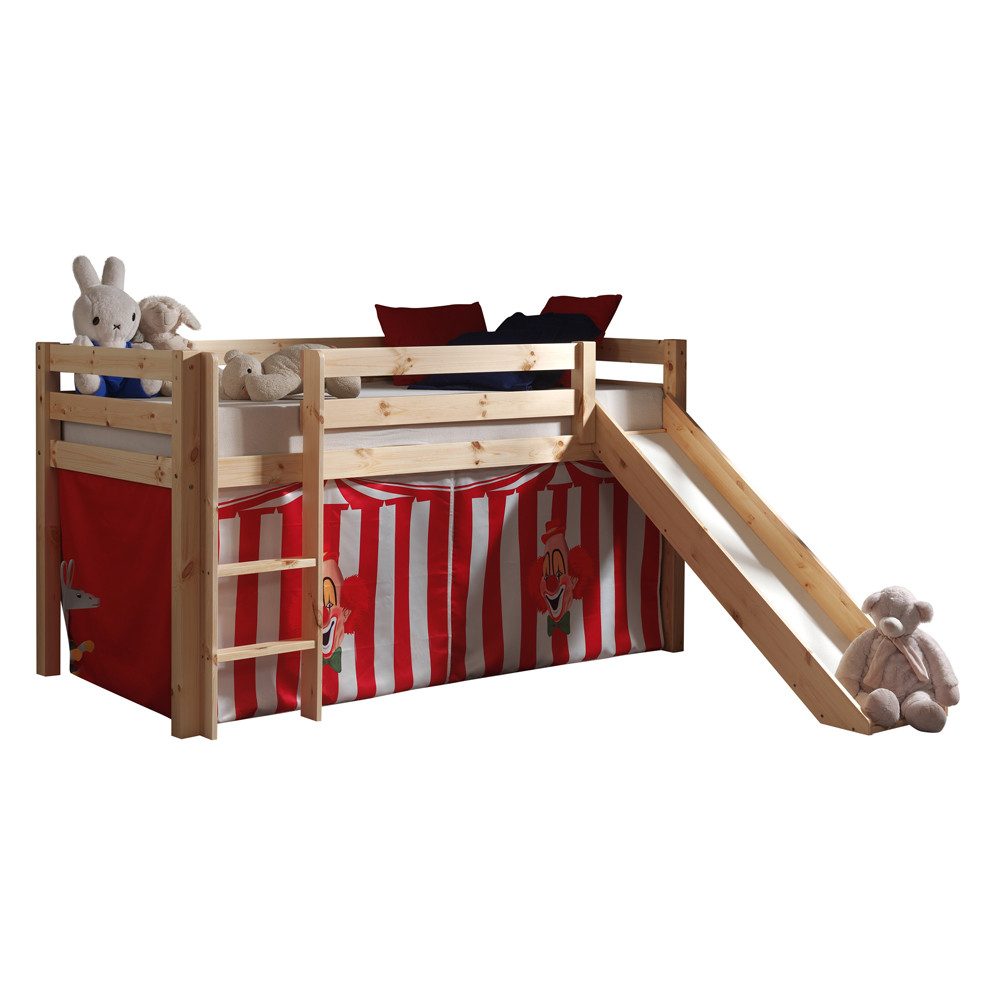 Spielbett Kinderzimmer mit Textil Set Zirkus incl. Rutsche PINOO-12 in Kiefer massiv natur lackiert