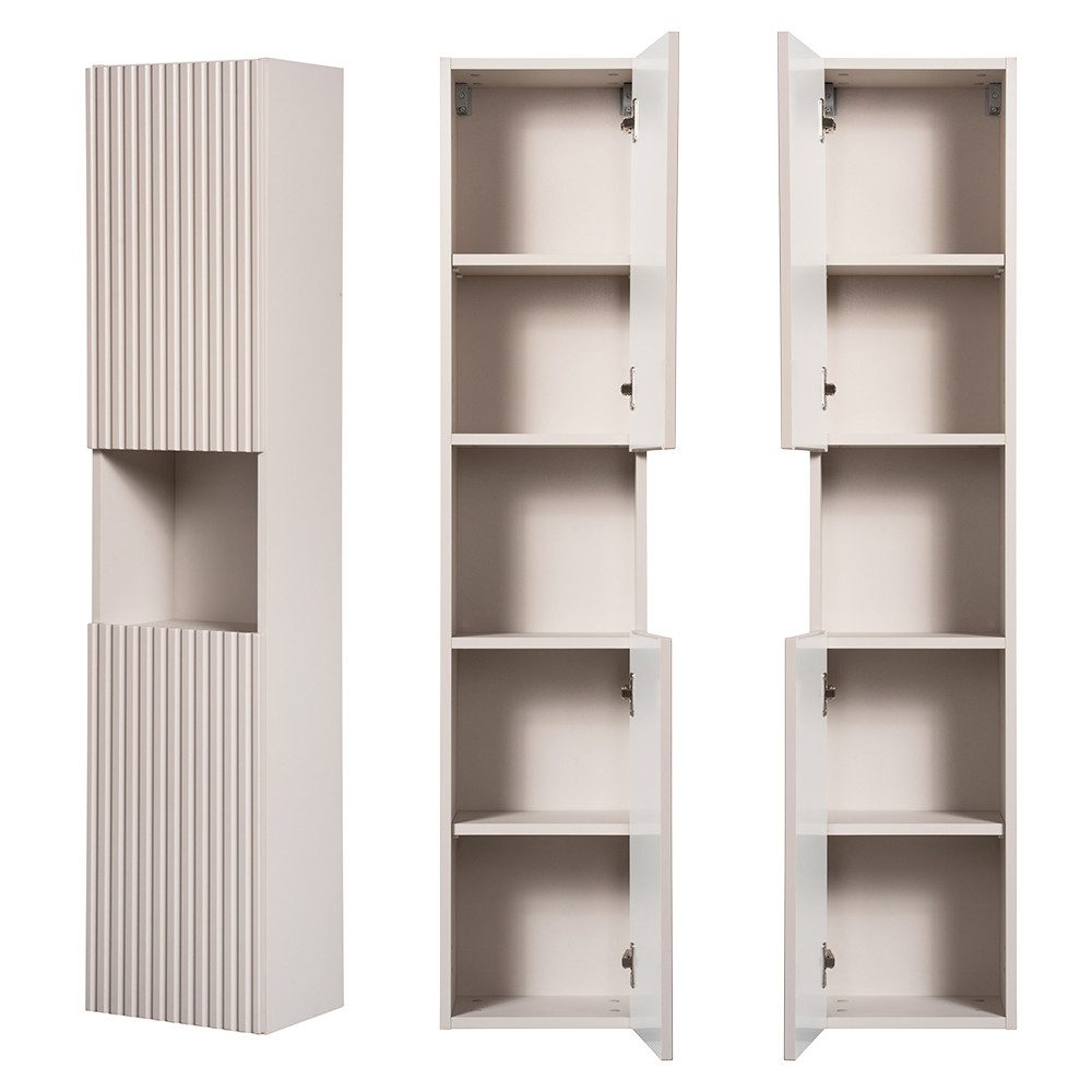 Diese Serie besticht durch ihre klaren, geradlinigen Formen und zeitlose Eleganz, hervorgehoben durch vertikale Rillen an den Fronten, die jedem Stück Tiefe und Charakter verleihen.