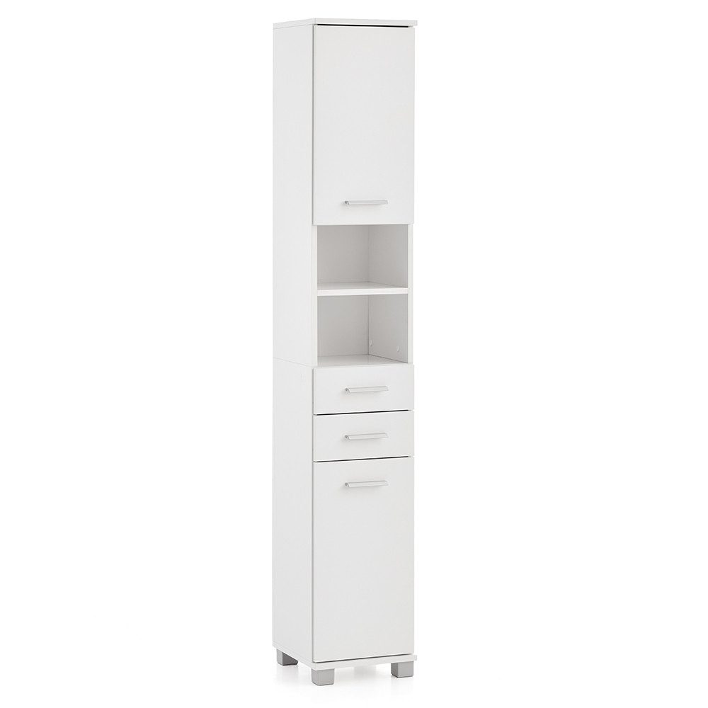 Der moderne Hochschrank bietet viel Stauraum und überzeugt mit einer eleganten, matten Oberfläche in Weiß – auch in drei weiteren Farben erhältlich. Mit zwei Türen, zwei Schubladen und zwei offenen Fächern kannst du Handtücher, Pflegeprodukte und Dekoration stilvoll unterbringen. Die schmale, hohe Bauweise macht ihn ideal für kleine und große Badezimmer. Ein zeitloses Design, das Ordnung und Stil in dein Bad bringt!