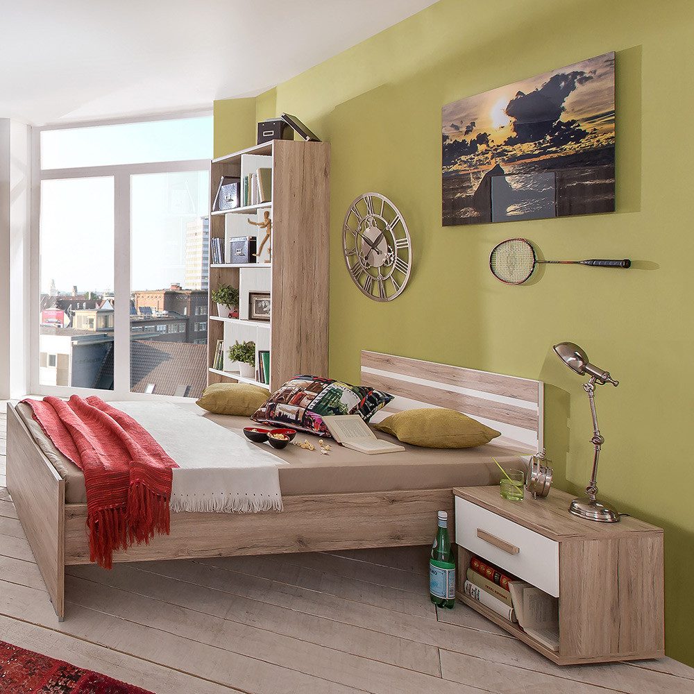 Mach dein Schlafzimmer zur Wohlfühloase! Dieses stilvolle Set in Eiche Nachbildung mit weißen Akzenten vereint modernes Design mit Funktionalität. Das 90x200 cm Bett bietet höchsten Komfort, während der Nachttisch und das Regal für Ordnung sorgen. Dank durchdachter Stauraumlösungen hast du alles griffbereit. Perfekt für ein harmonisches und praktisches Wohnkonzept!