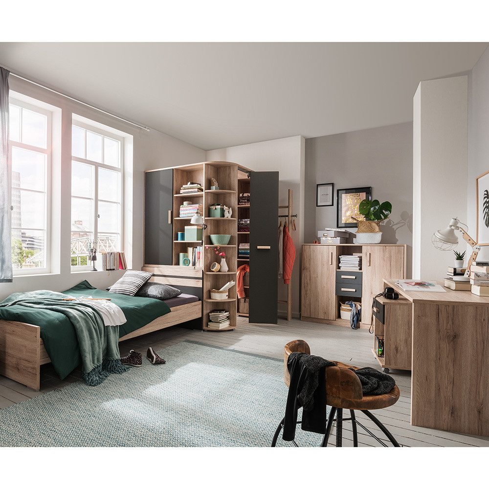 Dieses stilvolle Jugendzimmer-Set in Eiche-Nachbildung mit Graphit-Elementen bietet durchdachte Stauraumlösungen und modernes Design.