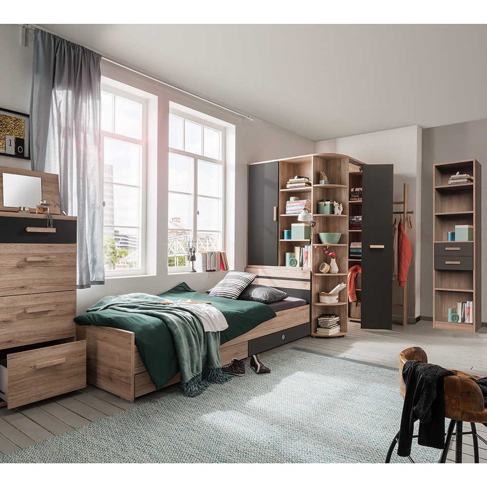 Dieses moderne Jugendzimmer-Set in Eiche-Nachbildung mit Graphit-Elementen bietet stilvollen Stauraum und ein durchdachtes Design.