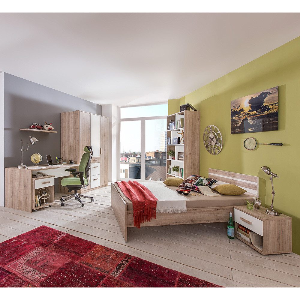 Die Kombination aus Kleiderschrank, Bett mit 90x200 cm Liegefläche, Schreibtisch mit Rollcontainer, Wandboard, Regal und Nachttisch bietet dir maximalen Stauraum und ein harmonisches Design. Die Eiche Nachbildung mit weißen Akzenten sorgt für eine moderne Optik. Hochwertige Materialien und durchdachte Funktionen machen dieses Set zu einer perfekten Lösung für dein Zimmer.