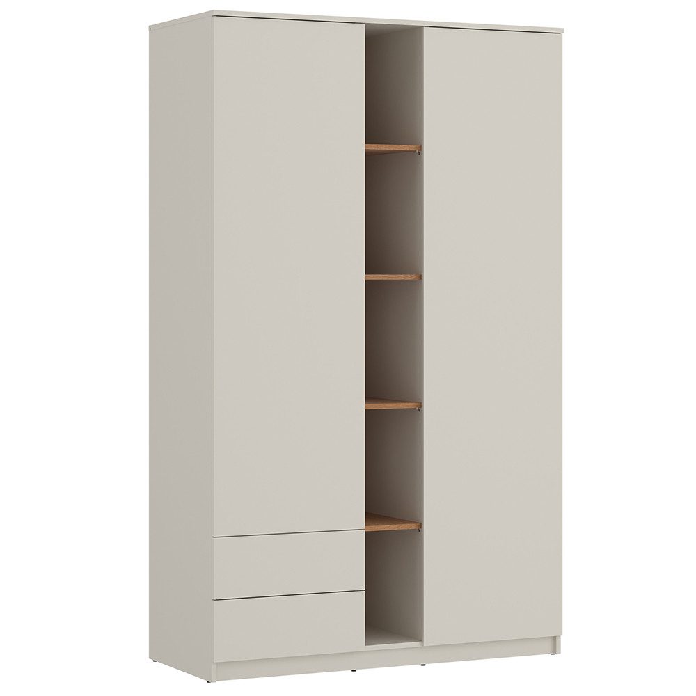 Dieser universell einsetzbare Kleiderschrank vereint modernes Design und Funktionalität. Gefertigt mit widerstandsfähiger Melaminharzbeschichtung in elegantem Kaschmir mit Karmel-Eiche-Dekor, ist es nicht nur optisch ansprechend, sondern auch besonders unempfindlich gegenüber äußeren Einflüssen. Mit zwei Türen, zwei grifflosen Schubladen, fünf offenen Fächern und einer Kleiderstange bietet er vielseitigen Stauraum für Kleidung, Arbeitsutensilien, persönliche Gegenstände oder Dekor. Hochwertige Metallbeschläge garantieren Langlebigkeit und Stabilität. Ob im Schlafzimmer, Jugendzimmer oder als praktischer Stauraum im Flur – dieser Schrank fügt sich harmonisch in jede Einrichtung ein.
