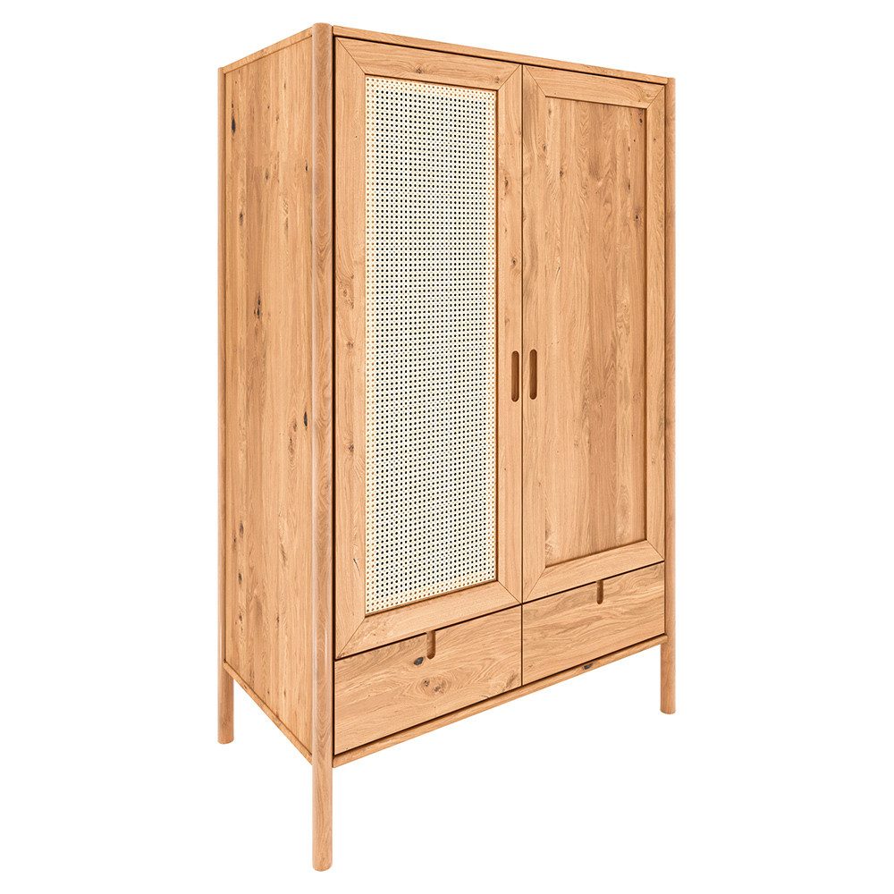 Die zwei Türen, von denen eine mit Rattanfront verziert ist, verleihen dem Schrank eine natürliche, luftige Optik. Hinter den Türen befinden sich vier Einlegeböden und eine Kleiderstange, die dir viel Platz für deine Kleidung bieten. Zwei Schubladen bieten zusätzlichen Stauraum für Accessoires oder kleinere Dinge. Все Schubladen und Türen sind mit der praktischen Softclose-Technologie ausgestattet, die für ein sanftes und leises Спрятать sorgt.