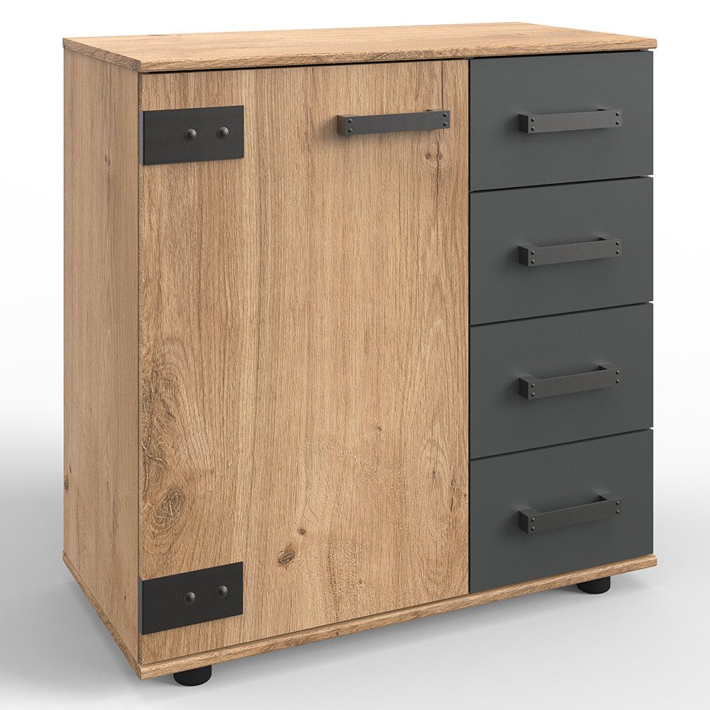 Du hast die Wahl zwischen zwei Farbvarianten - Graphit mit Fichte Nb. oder Eiche Nb. mit Graphit - beide bieten eine natürliche Holzoptik, die deinem Schlafzimmer eine warme und einladende Atmosphäre verleihen. Metallische Beschläge in Hammerschlag-Optik und dekorative Möbelgriffe schaffen einen spannenden Kontrast und unterstreichen den industriellen Charme der Möbelstücke.