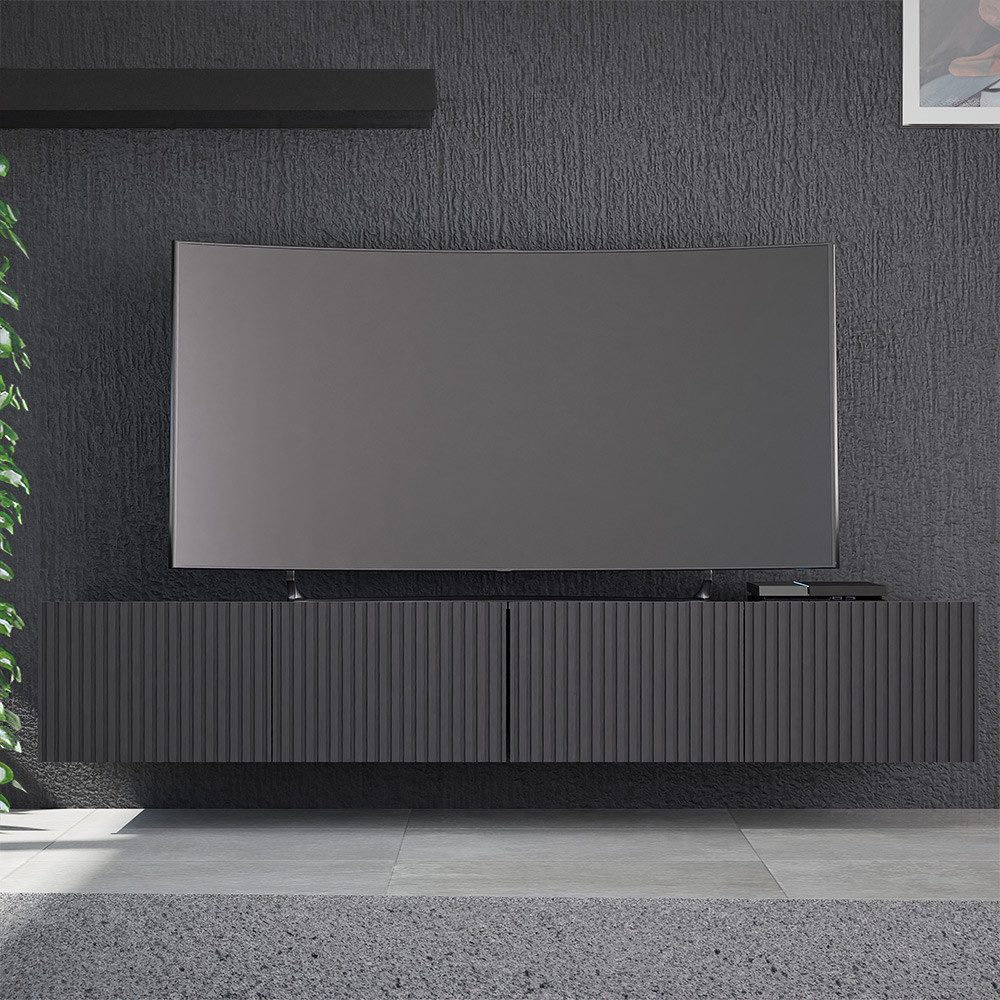 Dieses Mediaboard in schwarz matt verbindet klare Formen mit ausdrucksstarkem Design. Die Rillenstruktur auf der Front sorgt für Dynamik und macht die beiden Elemente zu einem echten Blickfang. Hinter vier Türen verbirgt sich großzügiger Stauraum für Technik und Alltagsdinge. Die Softclose-Funktion ermöglicht ein leises, angenehmes Спрятать. Ob schwebend an der Wand oder als markanter Akzent im Raum – du entscheidest. Robuste ABS-Kanten schützen zuverlässig und machen das Set zu einer langlebigen, stilvollen Lösung für dein Wohnzimmer.