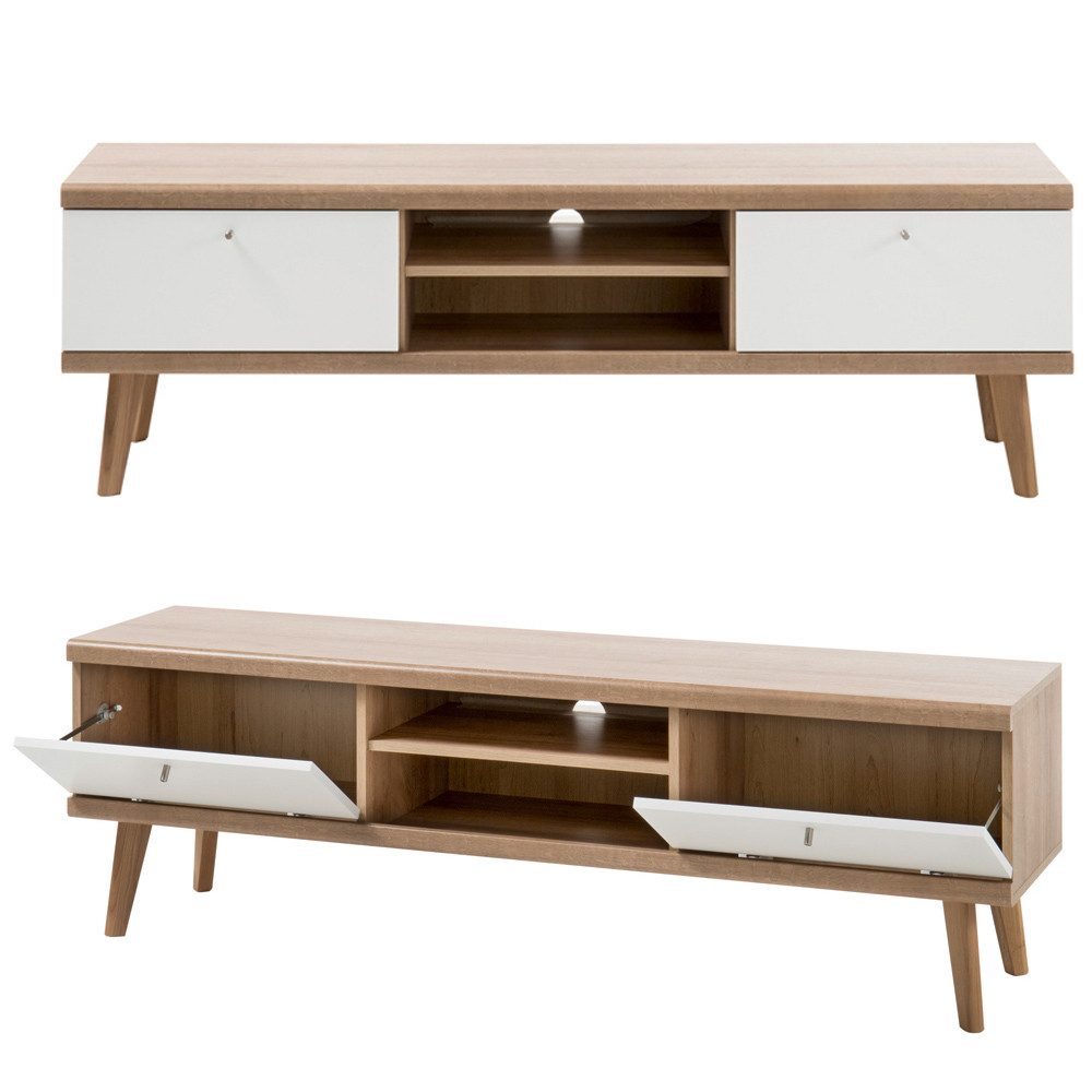 Die Wohn-, Esszimmer und Garderoben-Möbel-Serie MAINZ-61 im skandinavischen Retro-Design macht Ihre Räume zu einem Highlight. Schlichte Fronten in dezentem matt weiß gepaart mit schönen Möbelknöpfen und einem Korpus im Eiche Riviera Dekor. Nordisch, Vintage und dennoch absolut zeitlos.