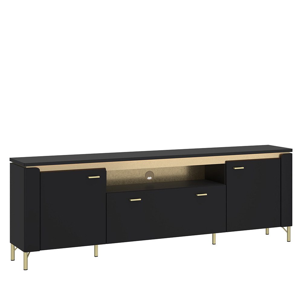 Die elegante Kombination aus mattem Schwarz, goldfarbenen Akzenten und integrierter Akzentbeleuchtung macht diesen Fernsehschrank zu einem echten Blickfang. Mit zwei Türen, einer Schublade, zwei Einlegeböden und einem offenen Fach, ausgestattet mit stilvollen Griffen bietet er großzügigen Stauraum für TV-Zubehör, Dekorationsartikel oder andere persönliche Gegenstände. Hochwertige Metallbeschläge und -scharniere sorgen für Stabilität und Langlebigkeit. Die widerstandsfähige Melaminharzbeschichtung macht den Fernsehschrank besonders pflegeleicht und unempfindlich gegenüber äußeren Einflüssen. Perfekt für das Wohnzimmer als stilvolle Aufbewahrungslösung – dieser Fernsehschrank verbindet Ästhetik und Funktionalität.