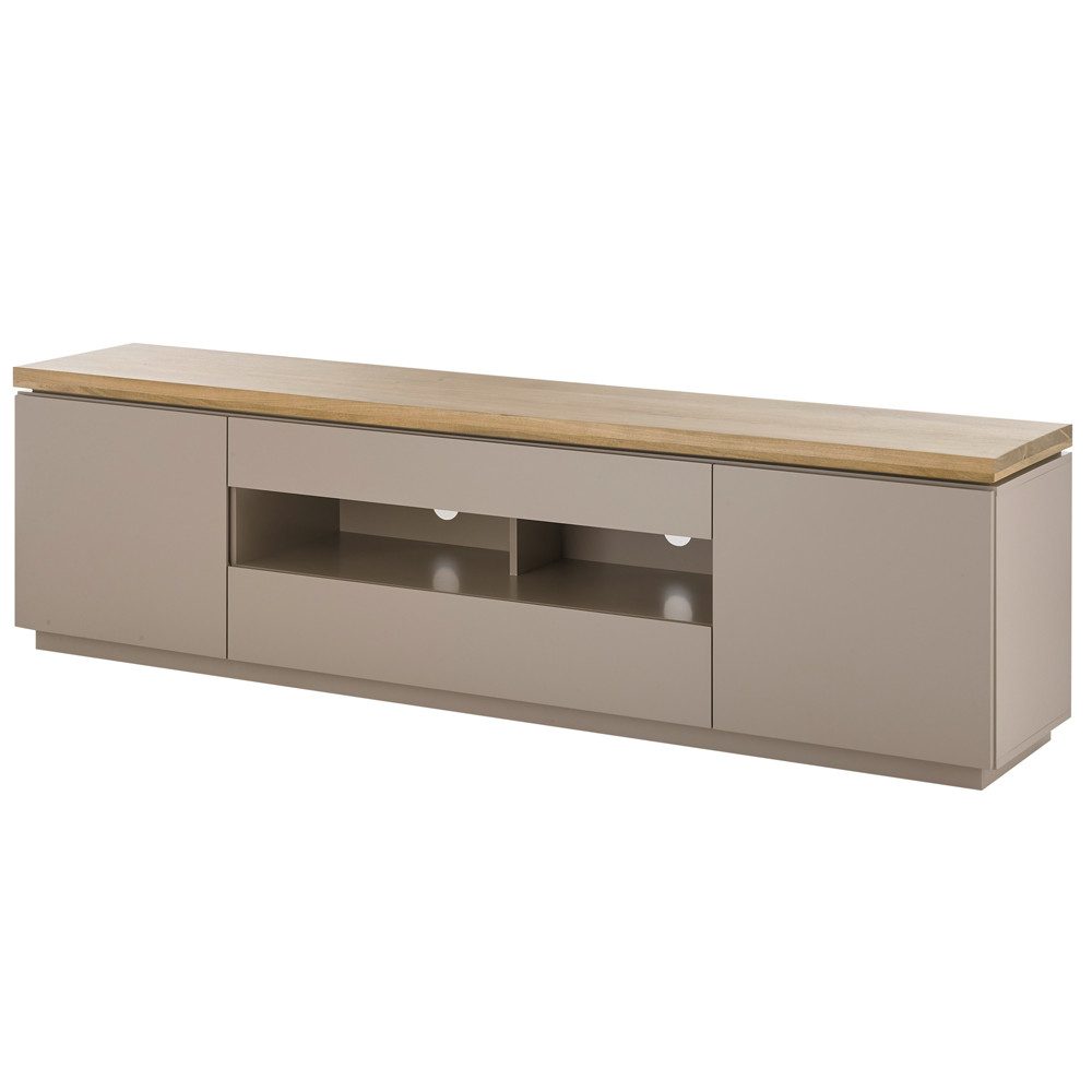 Ein modernes Statement für dein Wohnzimmer - dieses stilvolle Lowboard in einem warmen Grau mit massiver Akazienholz-Deckplatte vereint minimalistisches Design mit durchdachter Funktionalität. Die grifflose Gestaltung unterstreicht den zeitlosen Look, während Softclose-Türen und Schubladen mit Selbsteinzug ein sanftes Спрятать garantieren. Offene Fächer mit Kabeldurchlass sorgen für Ordnung und eine perfekte Organisation deiner Technik.