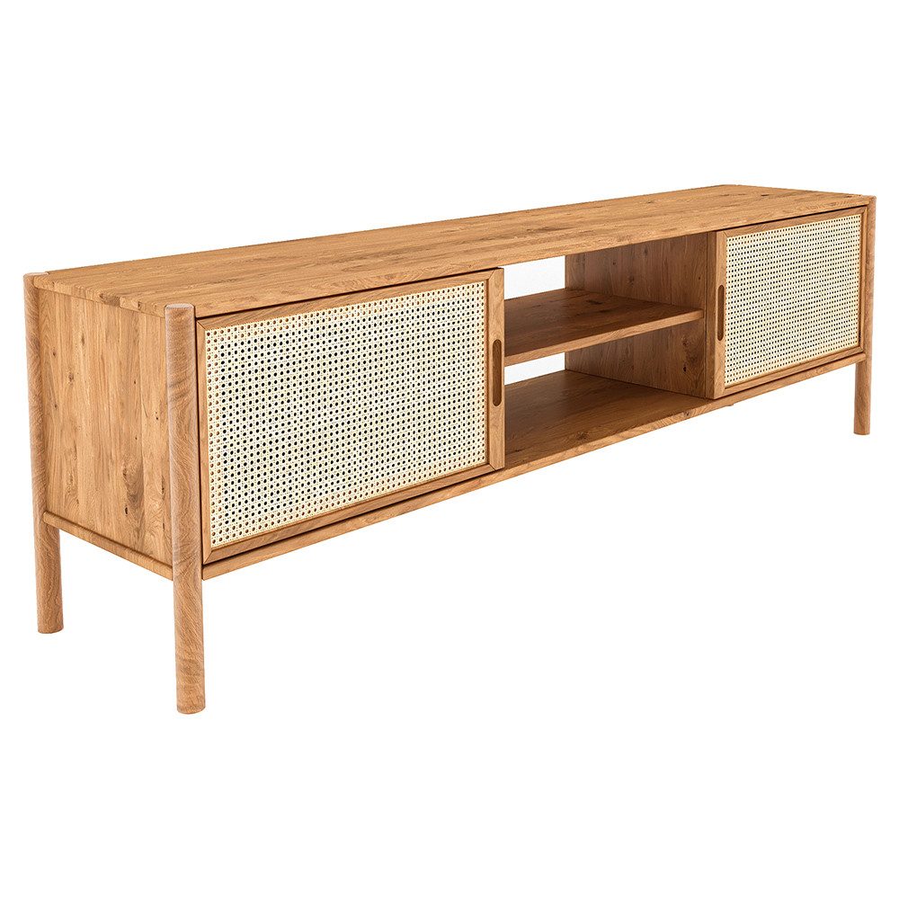 Die zwei Türen mit Rattanfront verleihen dem Lowboard eine natürliche, luftige Ausstrahlung und bieten Zugang zu einem großzügigen Stauraum. Die zwei Einlegeböden und zwei offenen Fächer bieten weiteren Platz für deine Dekoration oder häufig genutzte Gegenstände. Die Softclose-Technologie sorgt dafür, dass die Türen sanft und leise schließen, für ein besonders angenehmes Nutzungserlebnis.