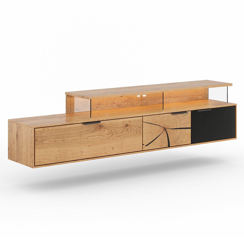 Starke Kontraste und natürliche Schönheit vereint: Dieses Lowboard aus massiver, geölter Eiche begeistert mit einer einzigartigen Front aus Hirnholz und schwarzem Glas. Eine praktische Aufteilung aus Klappe, Türen und offenen Fächern schafft vielseitigen Stauraum. Dank Softclose-System und montierter Lieferung kannst Du sofort entspannt einrichten – ob stehend oder wandhängend.