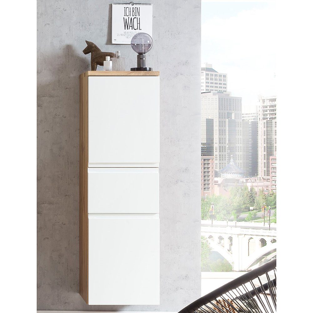 Grifflose Fronten in matt weiß und das trendstarke Holzdekor Wotan Eiche Nb. sorgen für einen schönen Kontrast in deinem Badezimmer. Ausgestattet mit Softclose-Türen und -Schubkästen und viel Stauraum wird dein Badezimmer zur Wellness Oase.