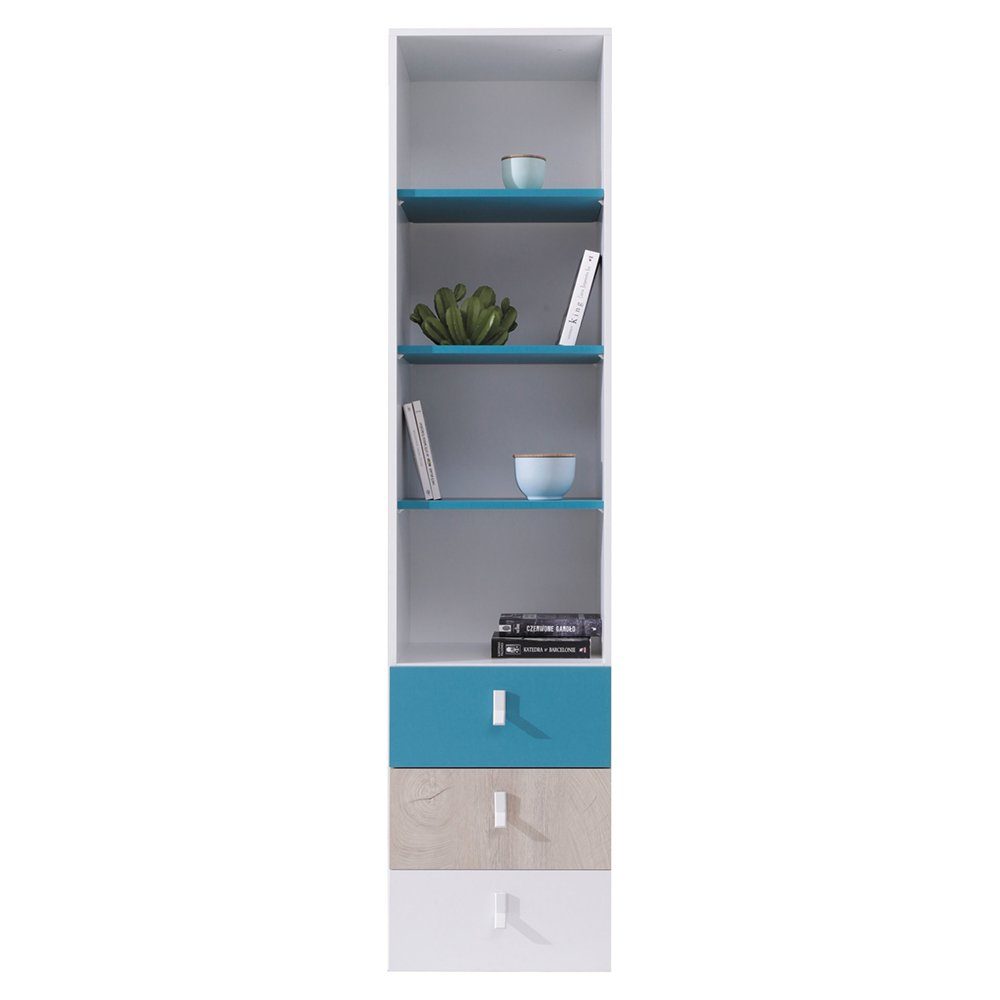 Belebe Kinder- und Jugendzimmer mit unserer vielseitigen Möbelkollektion, die in den Farbkombinationen schwarz/Eiche/beige oder weiß/Eiche/blau verfügbar ist.