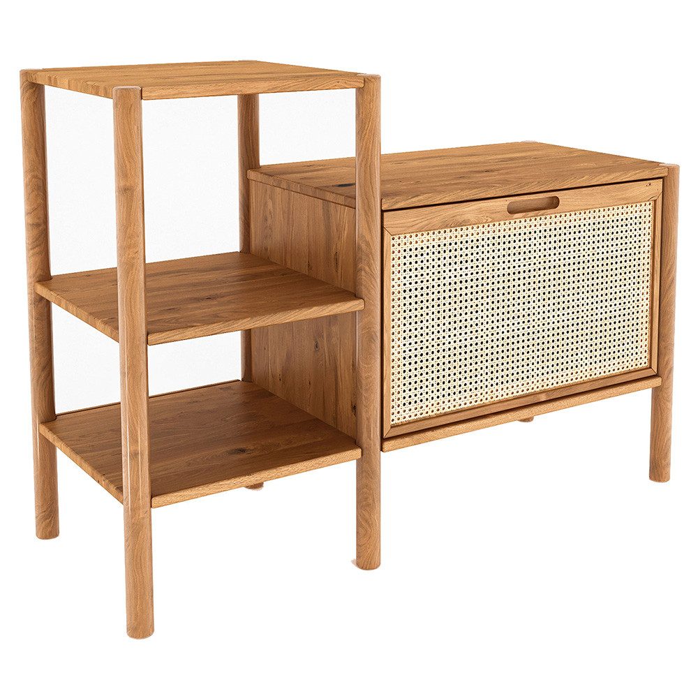 Die Klappe mit Rattanfront verleiht dem Schrank eine natürliche, luftige Note, während die zwei offenen Fächer perfekt für deine Dekorationen oder häufig genutzte Gegenstände geeignet sind. Das grifflosen Design mit eingefrästen Grifflöchern sorgt für eine moderne, minimalistische Optik, und die Softclose-Technologie ermöglicht ein sanftes und leises Спрятать der Klappe.