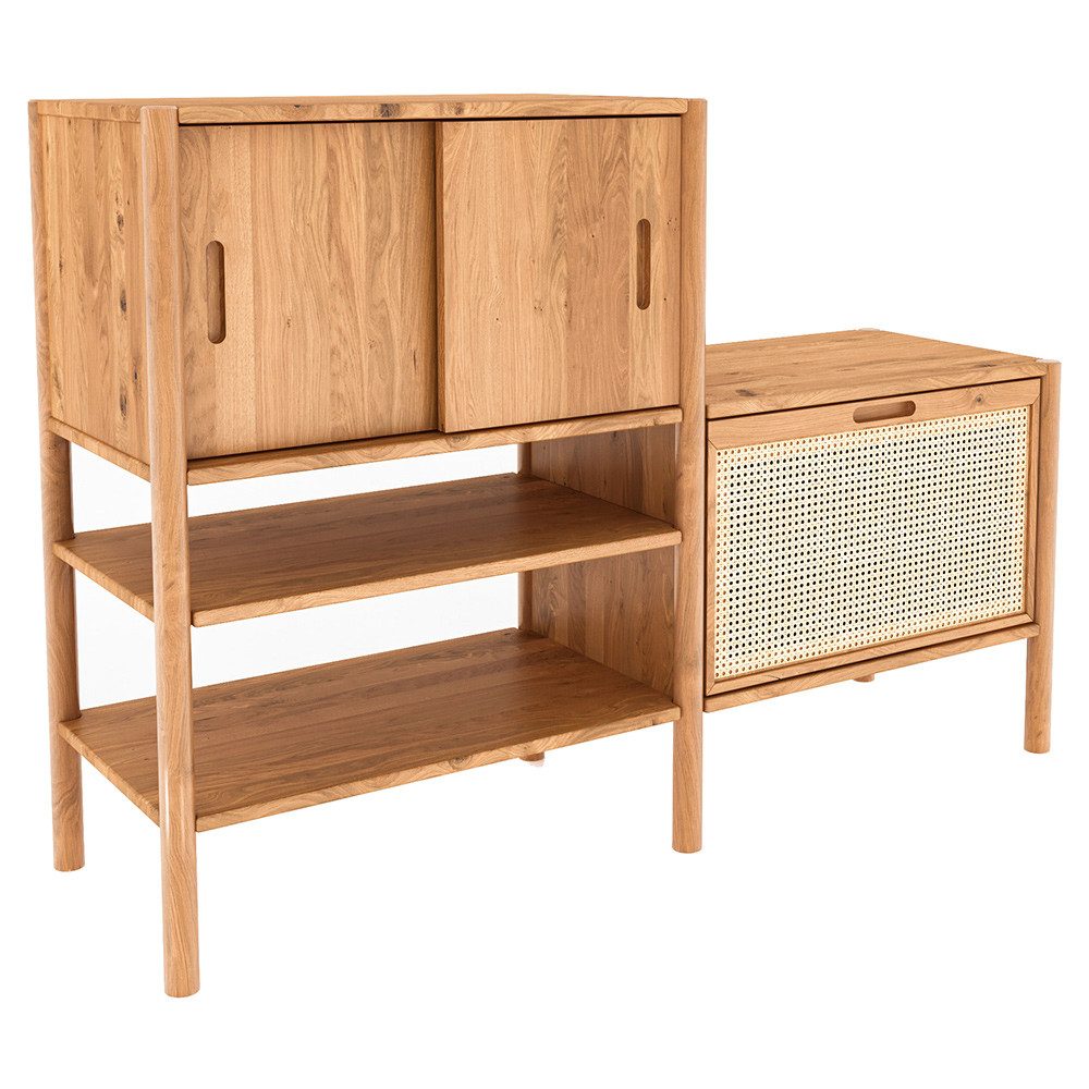 Die zwei Schiebetüren bieten großzügigen Stauraum, während die Klappe mit Rattanfront eine natürliche, luftige Note ins Design bringt. Zwei offene Fächer bieten Platz für Dekoration oder häufig genutzte Dinge. Das grifflosen Design mit eingefrästen Grifflöchern und die klare Linienführung verleihen diesem Möbelstück eine schlichte, moderne Eleganz.
