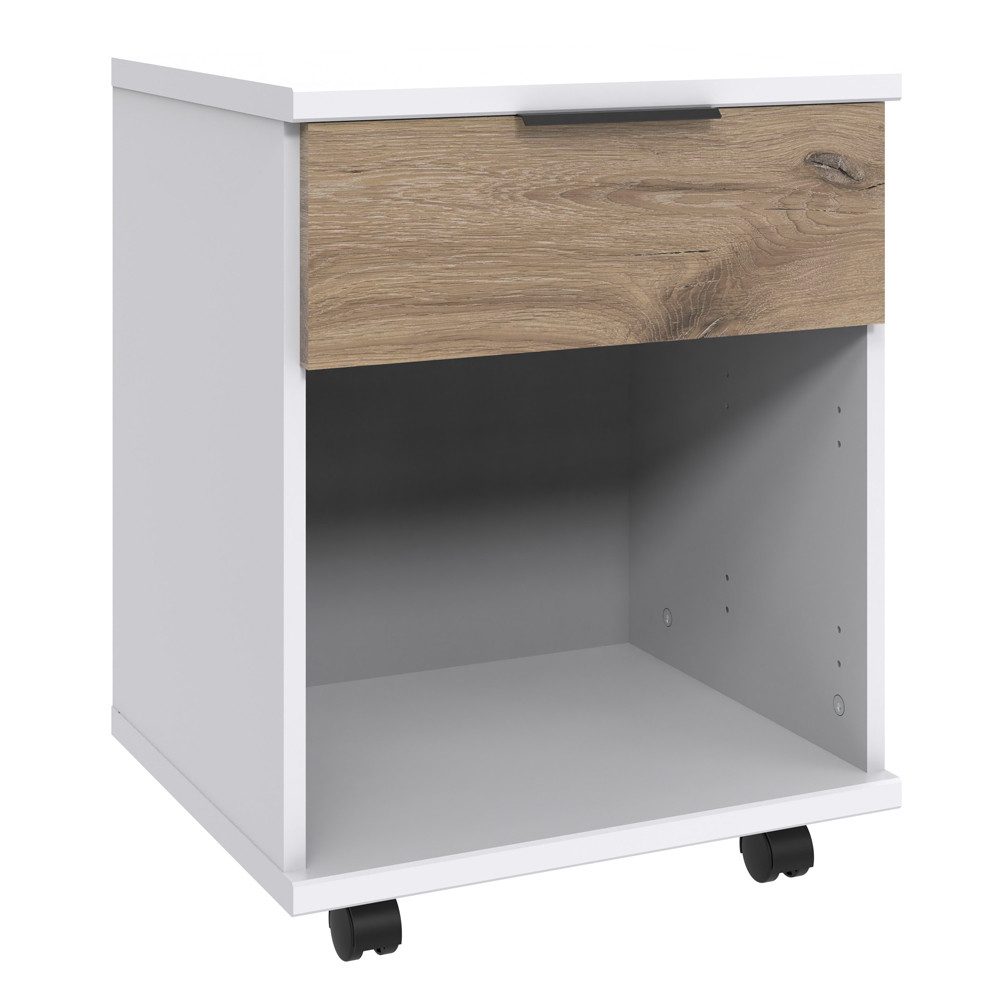 Stylisch, praktisch, durchdacht - dieser Rollcontainer bringt Ordnung in dein Kinder- und Jugendzimmer. Im modernen Weiß mit Akzenten in Eiche Dekor passt er perfekt in jedes Raumkonzept. Mit 46 cm Breite, einer Schublade für Kleinigkeiten und einem offenen Fach für Bücher und Hefte bietet er cleveren Stauraum. So hast du alles griffbereit, was du zum Lernen benötigst und dein Schreibtisch bleibt ordentlich. Dank leichtgängiger Rollen kannst du ihn jederzeit mühelos verschieben.