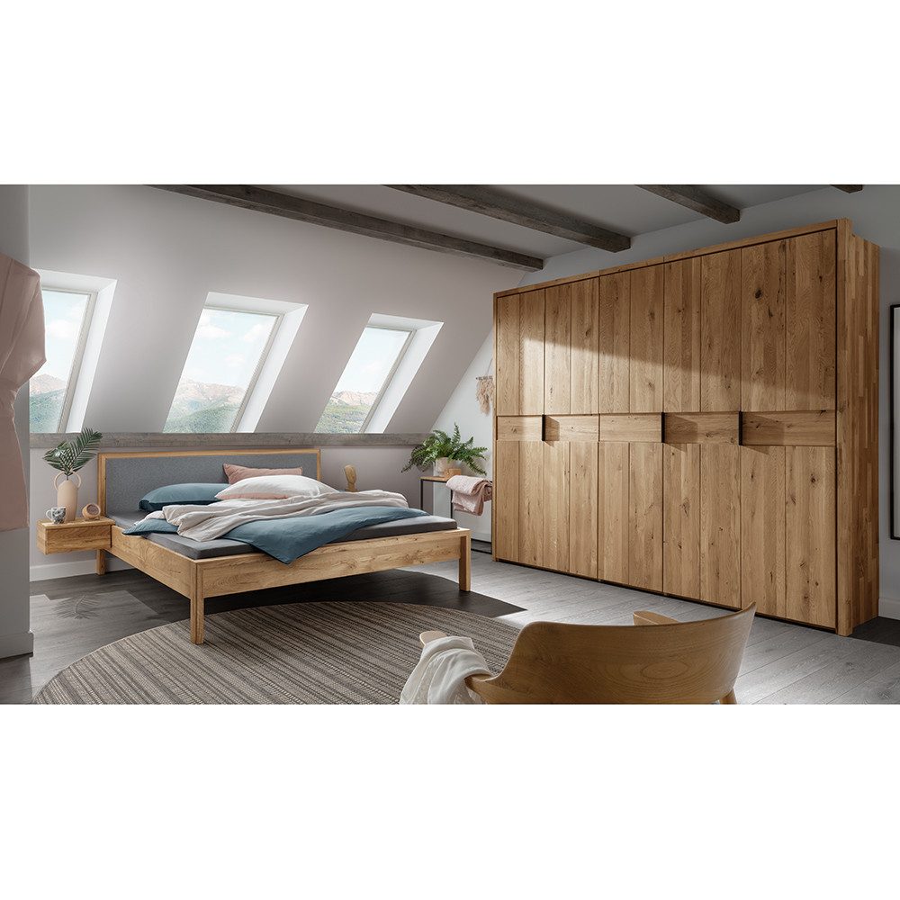 Unsere Serie bietet Kleiderschränke und zwei Bettvariationen, die perfekt auf deine individuellen Vorlieben abgestimmt sind. Wähle zwischen einem Bett mit einem stilvoll mit Filz bezogenen Kopfteil, das eine weiche, gemütliche Atmosphäre schafft, und einem klassischen Bett mit einem elegant gestalteten Holzkopfteil, das die natürliche Schönheit des Eichenholzes in den Mittelpunkt stellt.