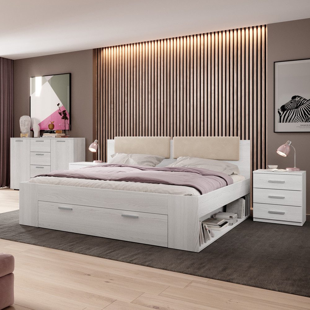 Mit dem GRAZ-83 Schlafzimmer Set zieht ein elegantes Raumambiente ein. Moderne Holzdekore mit ausdrucksvoller Maserung und fühlbarer Struktur prägen das Design dieser Schlafzimmerkombination. Die modernen und zeitlosen Möbel bilden die Basis für eine angenehme Atmosphäre zum Wohlfühlen und Entspannen. Das Bett sowie der 2-türige Schwebetürenschrank sind in jeweils 3 unterschiedlichen Breiten erhältlich. Der Bettrahmen ist mit einem gepolstertem Kopfteil aus Kunstleder ausgestattet. Du verwandelst dein Schlafzimmer nicht nur in eine Wohlfühloase, sondern hast zusätzlich auch noch viel Stauraum für alle deine Kleidungsstücke und anderen wichtigen Utensilien. Все Möbel sind zudem aus FSC®-zertifizierten Holzwerkstoffen gefertigt. Das Schlafzimmer Set ist in 2 verschiedenen Farbkombinationen erhältlich. Kombiniere jetzt dein eigenes Schlafzimmer Set nach deinen individuellen Wünschen. Du hast auch die Möglichkeit, einen unserer Kombinationsvorschläge zu wählen.