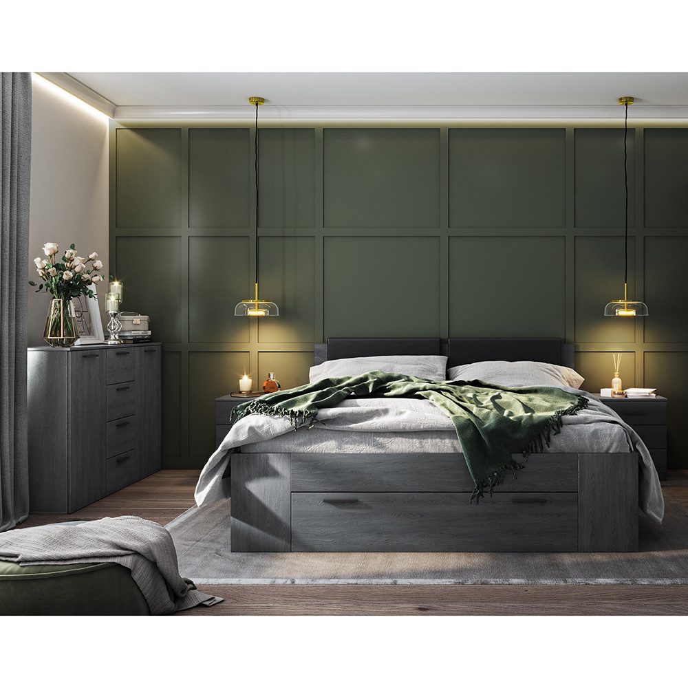 Das Bett bietet mit einer Schublade im Fußteil und offenen Fächern an den Seiten cleveren Stauraum. Die Nachttische mit je drei Schubladen und die Kommode mit zwei Türen und vier Schubladen sorgen für zusätzlichen Platz und perfekte Ordnung. Die dunkle Eiche-Carbon-Nachbildung und schwarze Griffe runden das Set modern und zeitlos ab.