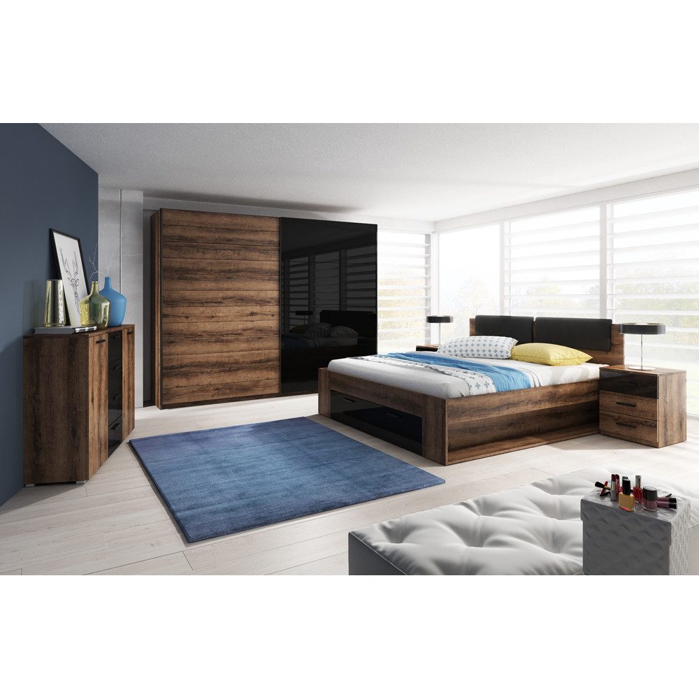 Mit dem GRAZ-83 Schlafzimmer Set zieht ein elegantes Raumambiente ein. Moderne Holzdekore mit ausdrucksvoller Maserung und fühlbarer Struktur prägen das Design dieser Schlafzimmerkombination. Die modernen und zeitlosen Möbel bilden die Basis für eine angenehme Atmosphäre zum Wohlfühlen und Entspannen. Das Bett sowie der 2-türige Schwebetürenschrank sind in jeweils 3 unterschiedlichen Breiten erhältlich. Der Bettrahmen ist mit einem gepolstertem Kopfteil aus Kunstleder ausgestattet. Du verwandelst dein Schlafzimmer nicht nur in eine Wohlfühloase, sondern hast zusätzlich auch noch viel Stauraum für alle deine Kleidungsstücke und anderen wichtigen Utensilien. Все Möbel sind zudem aus FSC®-zertifizierten Holzwerkstoffen gefertigt. Das Schlafzimmer Set ist in 2 verschiedenen Farbkombinationen erhältlich. Kombiniere jetzt dein eigenes Schlafzimmer Set nach deinen individuellen Wünschen. Du hast auch die Möglichkeit, einen unserer Kombinationsvorschläge zu wählen.