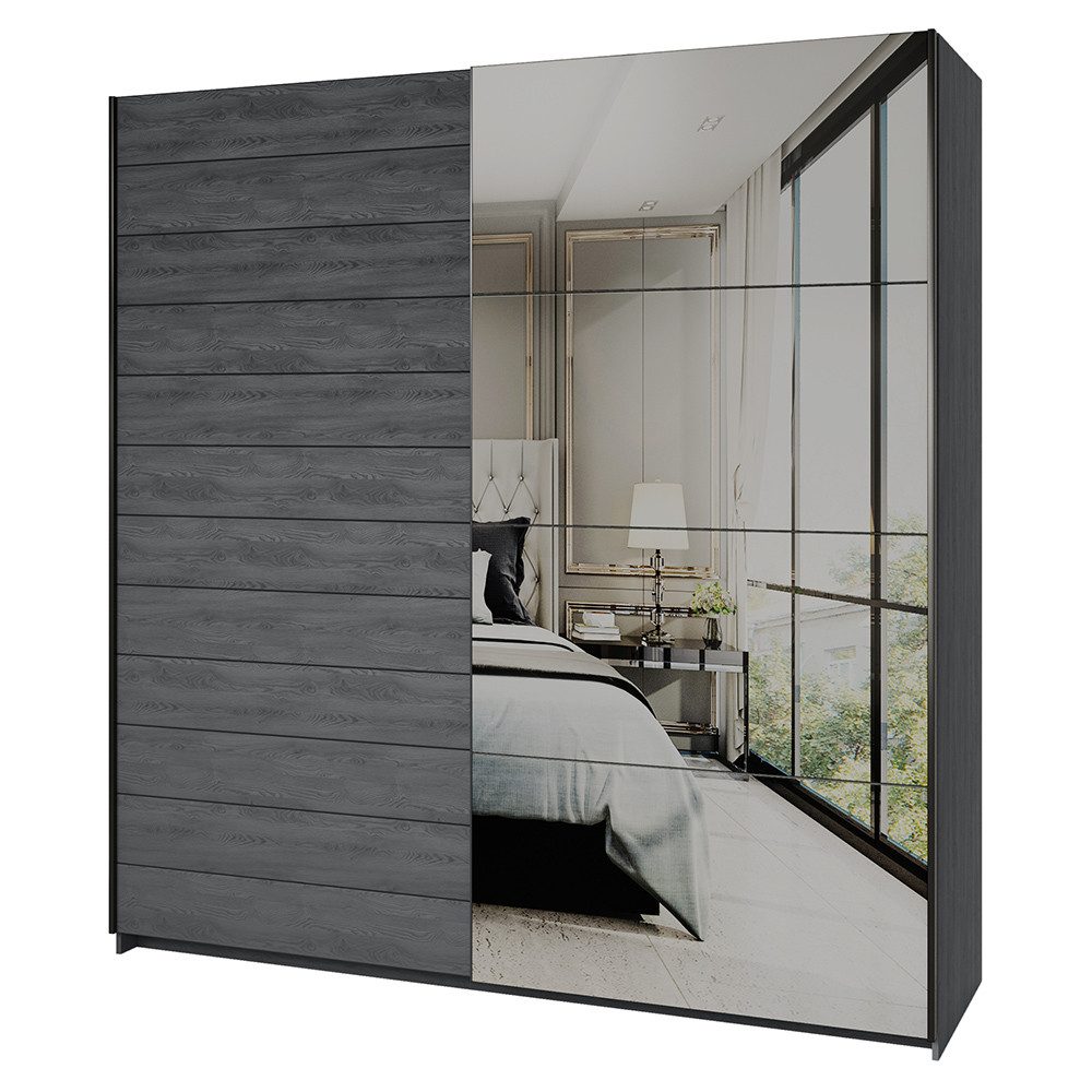Die 200 cm breite Konstruktion bietet großzügigen Stauraum: Hinter den zwei Türen findest du eine Kleiderstange für deine Hängemode und fünf praktische Böden für gefaltete Kleidung oder Accessoires. Die Spiegelfront auf einer Tür verleiht dem Raum Weite und setzt elegante Akzente.