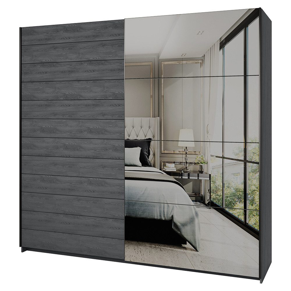 Die 221 cm breite Konstruktion bietet großzügigen Stauraum: Hinter den zwei Türen findest du eine Kleiderstange für deine Hängemode und fünf praktische Böden für gefaltete Kleidung oder Accessoires. Die Spiegelfront auf einer Tür verleiht dem Raum Weite und setzt elegante Akzente.