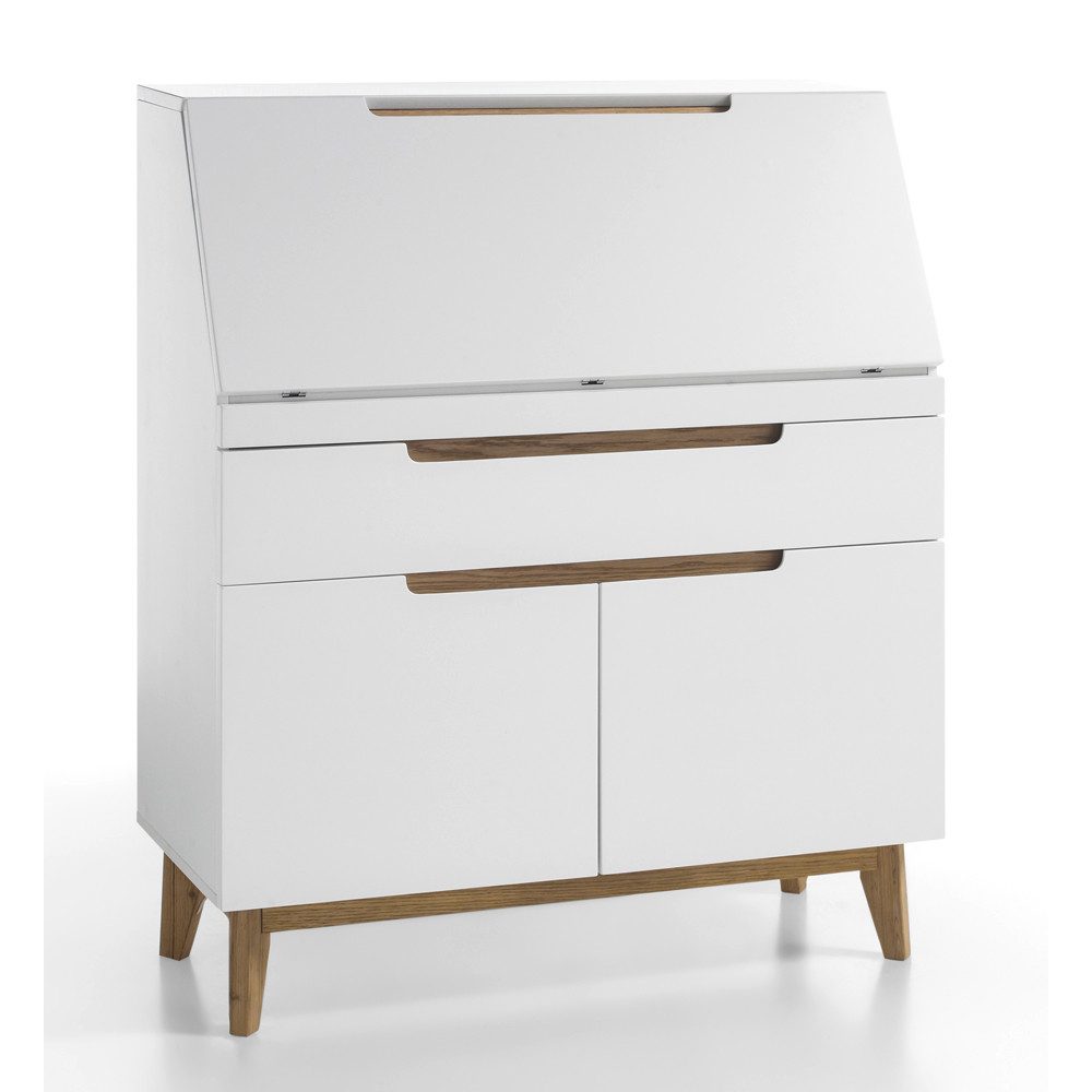 Sekretär Schreibtisch CERVERA-05 in weiß matt lackiert mit furniertem Massivholz in Asteiche geölt