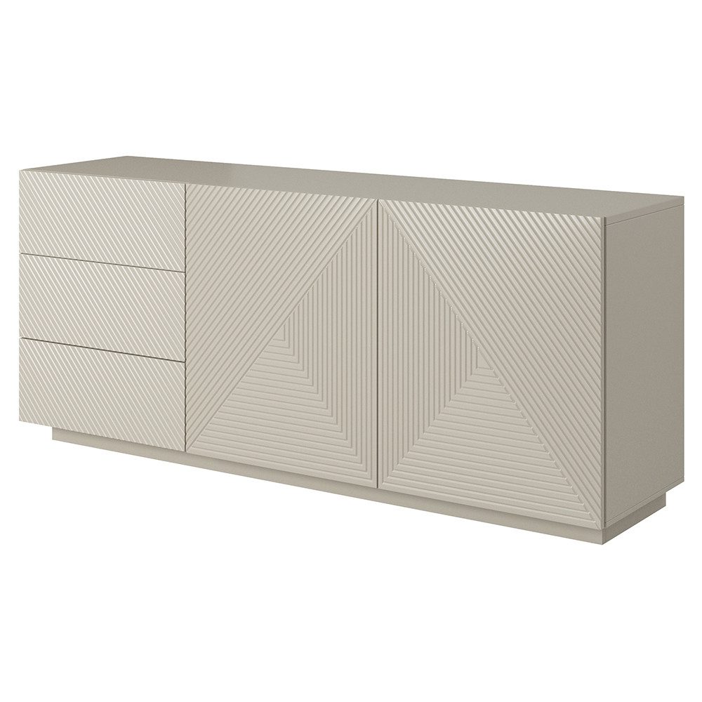 Drei grifflos integrierte Schubladen auf der linken Seite bieten dir schnellen Zugriff auf Kleinteile, während die beiden Türen zusätzlichen Stauraum für alles andere verbergen. Das kaschmirfarbene Design sorgt für eine zurückhaltende Eleganz – perfekt für moderne Wohnbereiche.