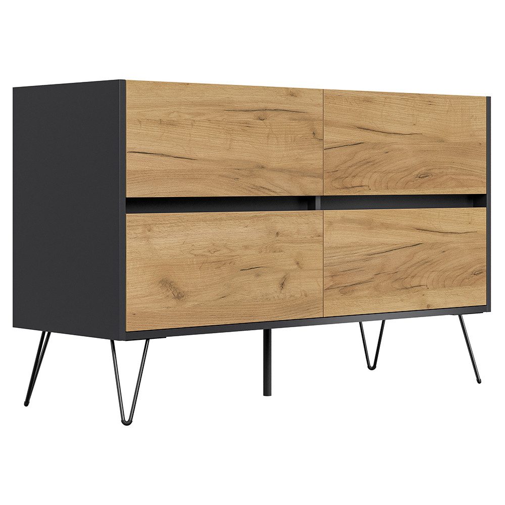 Modern, wohnlich und perfekt durchdacht: Dieses Sideboard kombiniert einen ruhigen Korpus in graphit mit vier Schubladen in natürlicher Eiche-Nachbildung.