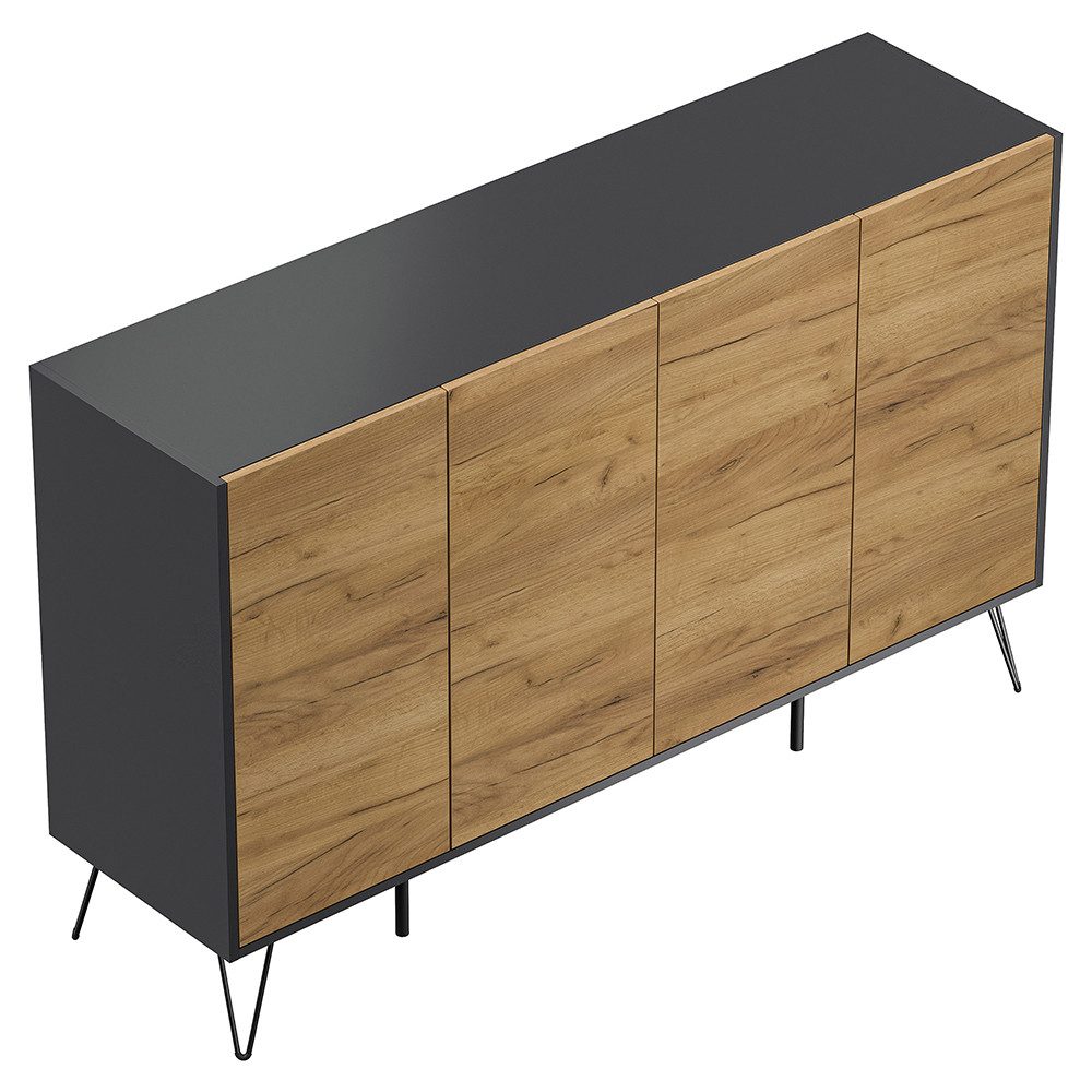 Stilvoll, strukturiert und mit natürlicher Ausstrahlung: Dieses Sideboard kombiniert einen ruhigen Korpus in Graphit mit wohnlichen Fronten in Eiche-Nachbildung – für ein modernes Statement mit Wärme. Hinter vier Türen mit drei festen Böden bietet das Möbelstück großzügigen Stauraum für alles, was ordentlich verstaut sein soll. Softclose sorgt für leises Спрятать, filigrane Metallfüße bringen Leichtigkeit.
