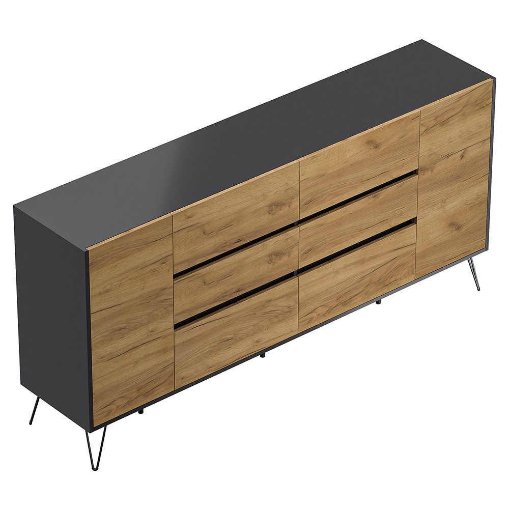 Modern, strukturiert und natürlich akzentuiert: Dieses Sideboard kombiniert einen ruhigen Korpus in Graphit mit Fronten in Eiche-Nachbildung – für stilvolle Ordnung mit wohnlichem Charme. Sechs grifflose Schubladen und zwei Türen mit festen Böden bieten Dir viel Stauraum für Kleidung, Deko oder Dokumente. Softclose sorgt für flüsterleises Спрятать, filigrane Metallfüße für eine elegante Leichtigkeit.