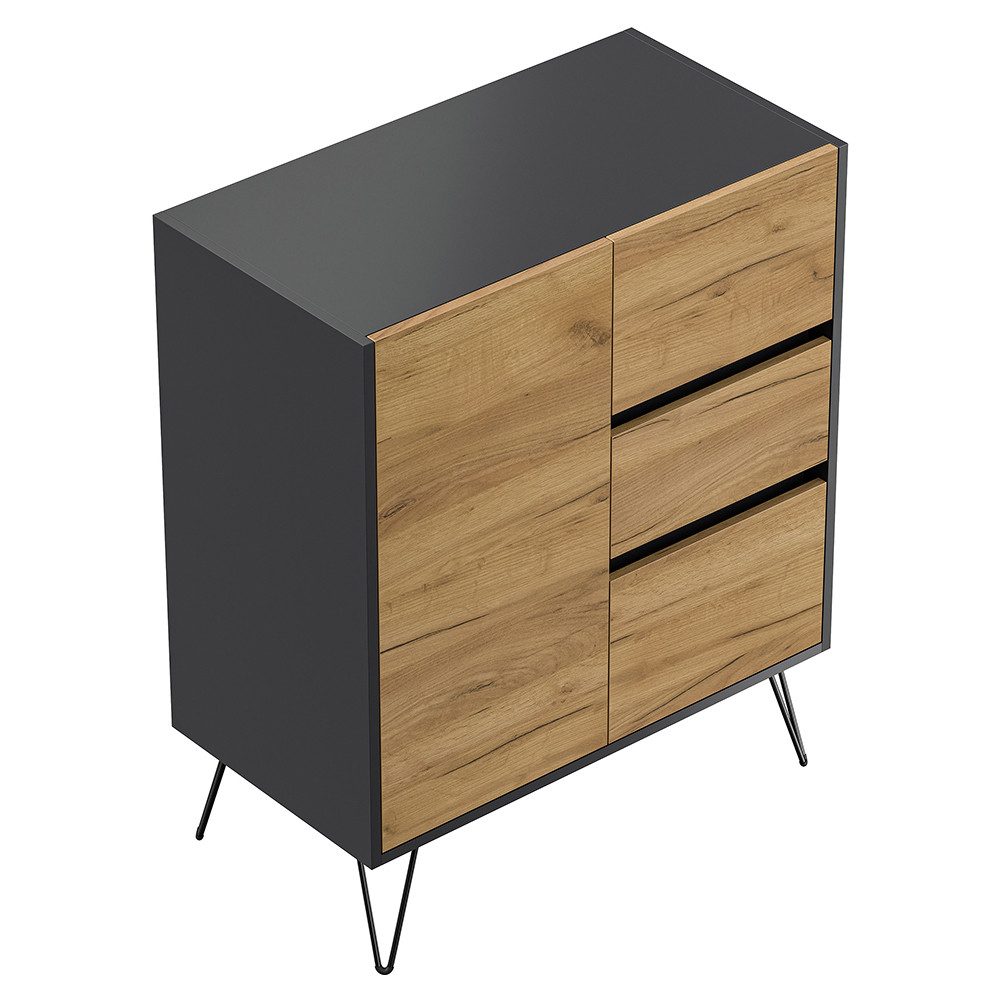 Modern, wohnlich und funktional – dieses kompakte Sideboard vereint einen dunklen Korpus in Graphit mit warmen Fronten in Eiche-Nachbildung. Die Kombination sorgt für stilvolle Ausstrahlung mit natürlichem Akzent. Hinter einer Tür mit Einlegeboden und in drei Schubladen findest Du strukturierten Stauraum für Deine täglichen Dinge. Softclose sorgt für sanftes Спрятать, filigrane Metallfüße für eine luftige, elegante Optik.
