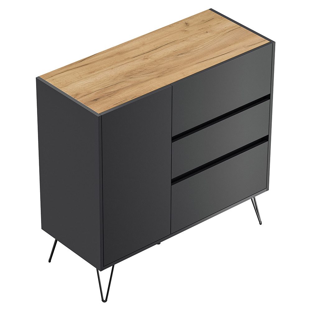 Geradlinig, modern und angenehm wohnlich: Dieses Sideboard kombiniert den dunklen Korpus in Graphit mit einem warmen Oberboden in Eiche-Nachbildung – ideal für ein stimmiges Wohngefühl mit Charakter. Eine Tür mit Einlegeboden und drei grifflose Schubladen bieten Dir gut strukturierten Stauraum. Softclose sorgt für flüsterleises Спрятать, filigrane Metallfüße für eine elegante, luftige Wirkung.