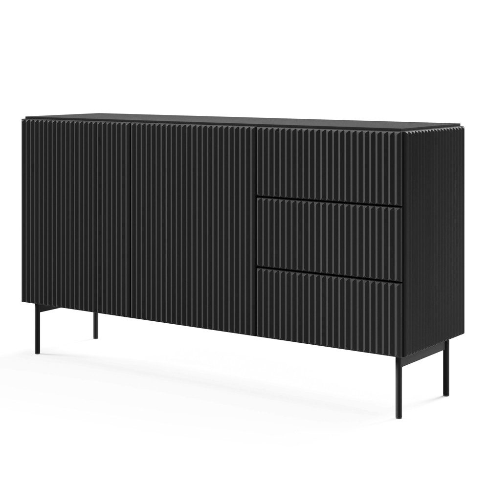 Das Sideboard MASSA-167 in Schwarz überzeugt durch seine kompakte Breite von 147 cm und ein modernes, klares Design. Fronten und Korpus aus MDF mit markanter Rillenoptik verleihen dem Möbel einen edlen Charakter, während strapazierfähige ABS-Kanten für Langlebigkeit sorgen. Zwei Türen mit Push-to-Open-Funktion sowie drei grifflos gestaltete Schubladen mit Vollauszug bieten dir cleveren Stauraum für Geschirr, Besteck oder persönliche Dinge. Auf eleganten Metallfüßen stehend, wirkt das Sideboard leicht und stabil zugleich – sichere dir jetzt diesen Allrounder für dein Zuhause!