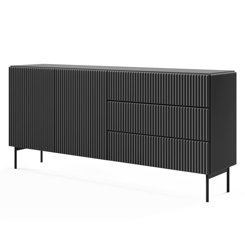 Das Sideboard MASSA-167 in Schwarz vereint markantes Design mit durchdachter Funktionalität. Fronten und Korpus aus MDF in stilvoller Rillenoptik wirken modern und edel, während robuste ABS-Kanten für Langlebigkeit sorgen. Neben zwei Türen mit Push-to-Open bietet es drei grifflos gestaltete Schubladen mit Vollauszug – ideal, um Besteck, Geschirr oder persönliche Dinge ordentlich zu verstauen. Auf eleganten Metallfüßen stehend, verbindet das 177 cm breite Sideboard Stabilität mit moderner Leichtigkeit – sichere dir jetzt diesen Allrounder!